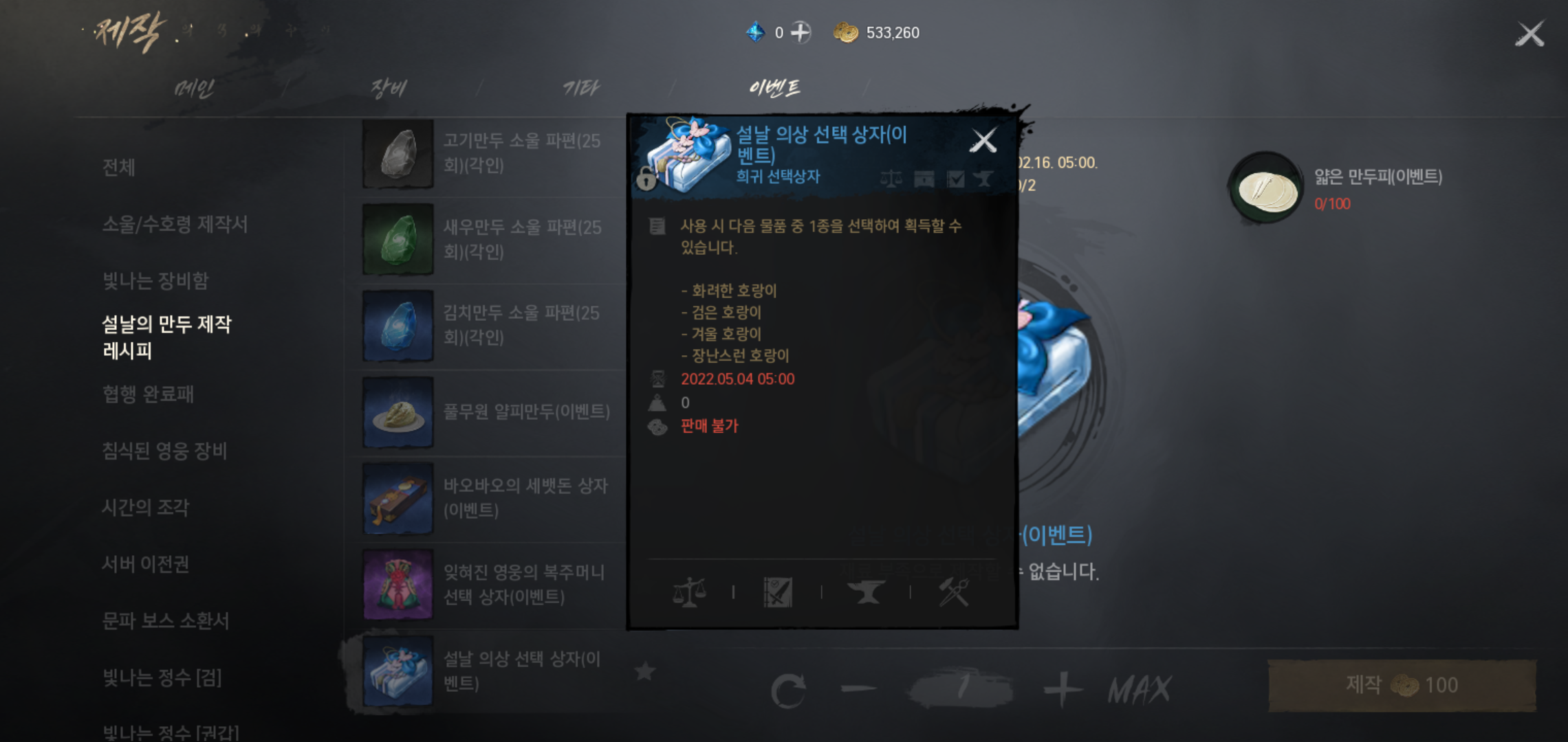 2022년 설맞이 이벤트 첫번째는 이벤트 던전 설날의 반달호수에서 몬스터를 처치해 얇은 만두피를 획득하고 설날의 만두 제작 레시피를 통해 다양한 보상을 제작할 수 있는 기회가 주어집니다. 설날의 반달 호수는 30 레벨 이상이라면 누구나 참여 가능하고, 안전 던전이라 몹에게 사망하더라도 경험치가 깎이지 않는 장점을 갖고 있습니다.