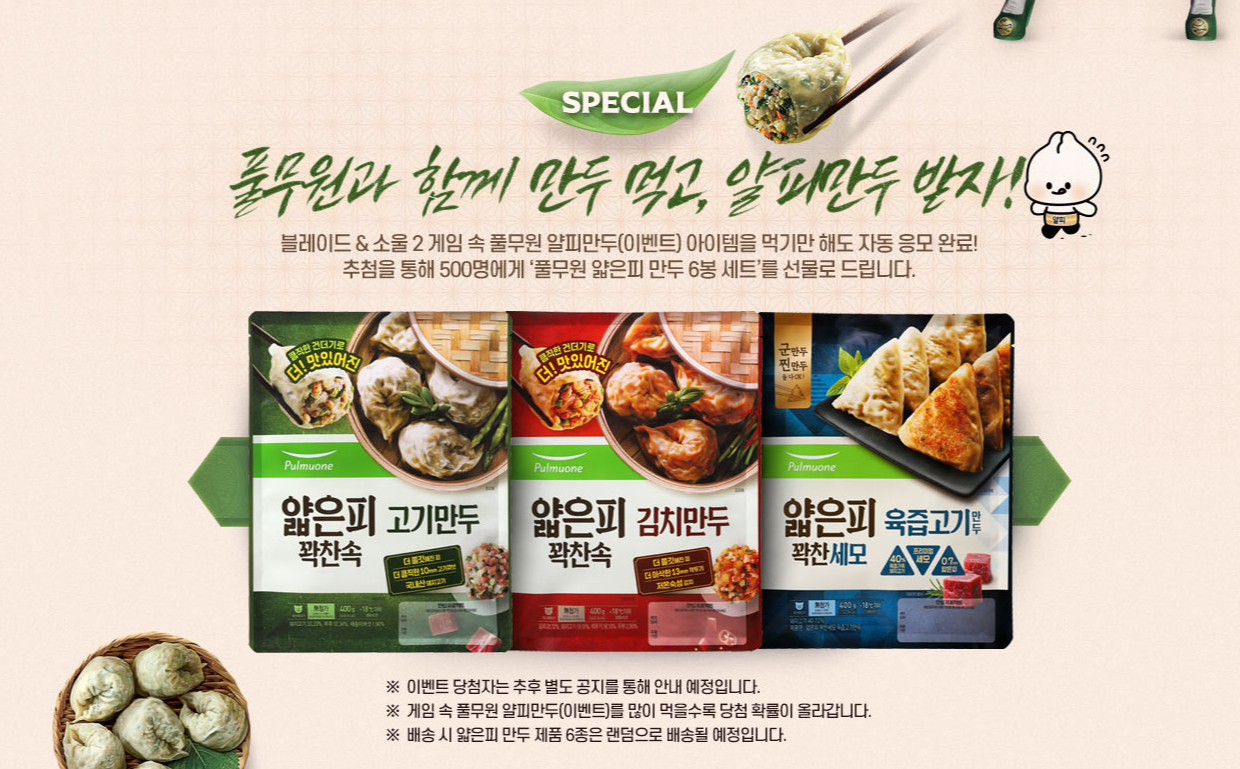 인게임 아이템 획득 외에도 얄피만두(이벤트) 아이템을 먹기만 하면 자동 응모되는 풀무원과 함께 만두 먹고 얄피만두 받자 이벤트도 진행 중입니다. 추첨을 통해 500명에게 풀무원 얇은피만두 6봉 세트가 선물로 주어지는데요, 게임 속 풀무원 얄피만두(이벤트)를 많이 먹을수록 당첨 확률이 올라간다고 하니 풀무원 얇은피 만두 선물이 탐나는 분들이라면 블소2 풀무원 얄피만두(이벤트)를 많이 챙겨도 좋을 것 같습니다.