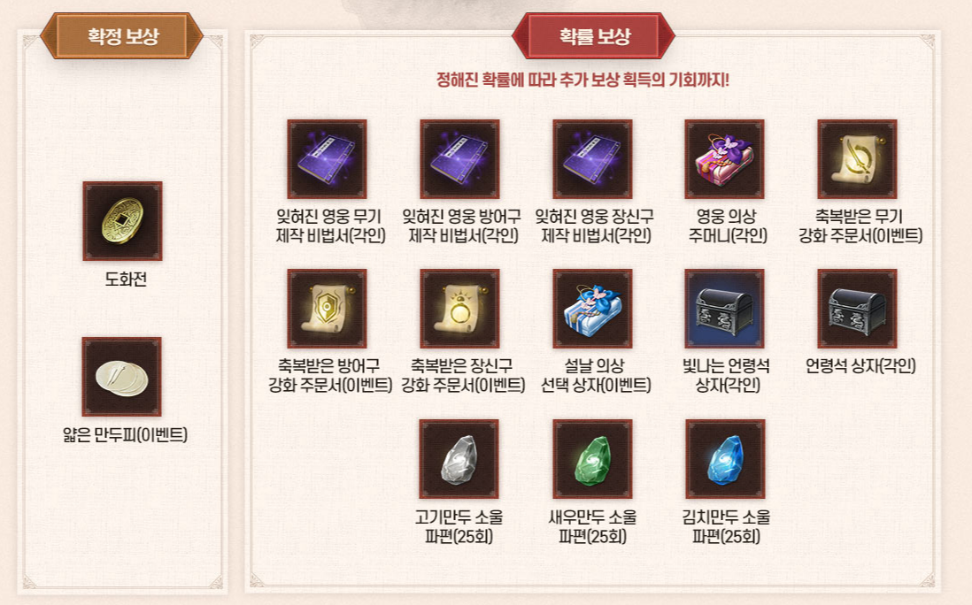 복 맞이 곤야차를 처치하고 획득할 수 있는 설맞이 봉마함(이벤트)안에는 얇은 만두피(이벤트)와 도화전은 확정으로 획득 할 수 있고, 확률에 따라 잊혀진 영웅 무기 제작 비법서(각인)을 포함해 영웅 의상 주머니(각인), 축복 받은 무기, 방어구, 장신구 강화 주문서(이벤트)등 특별한 보상을 획득할 수 있습니다.