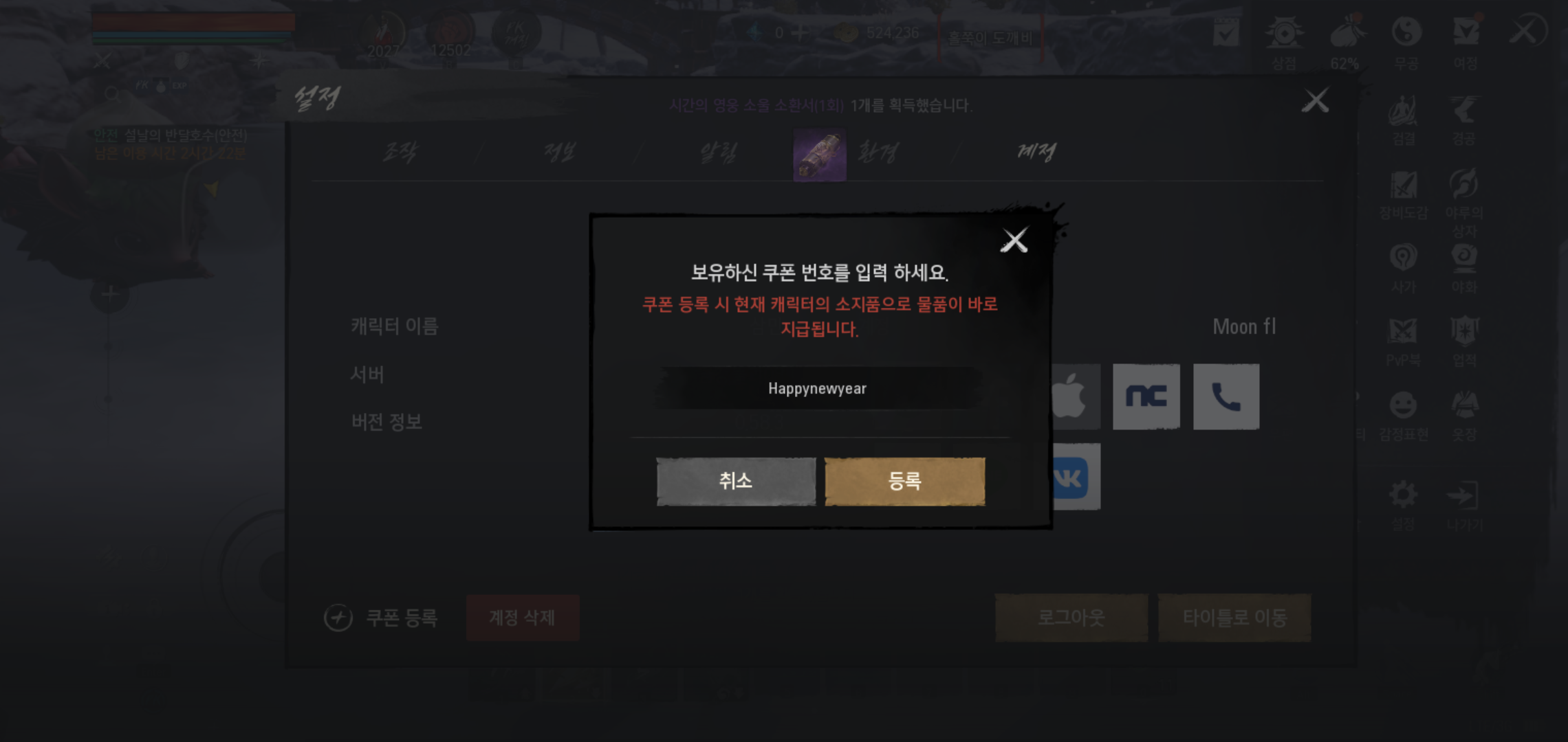 실패 확률 0% 설맞이 영웅 소울 소환 이벤트도 진행 중입니다. 새해 인사와 함께 공개된 쿠폰 번호를 입력하면 묻지도 따지지도 않고 영웅 소울 소환이 가능합니다. 쿠폰번호는 HAPPYNEWYEAR 로 대소문자 관계없이 입력하면 영웅 소울 소환을 할 수 있습니다.