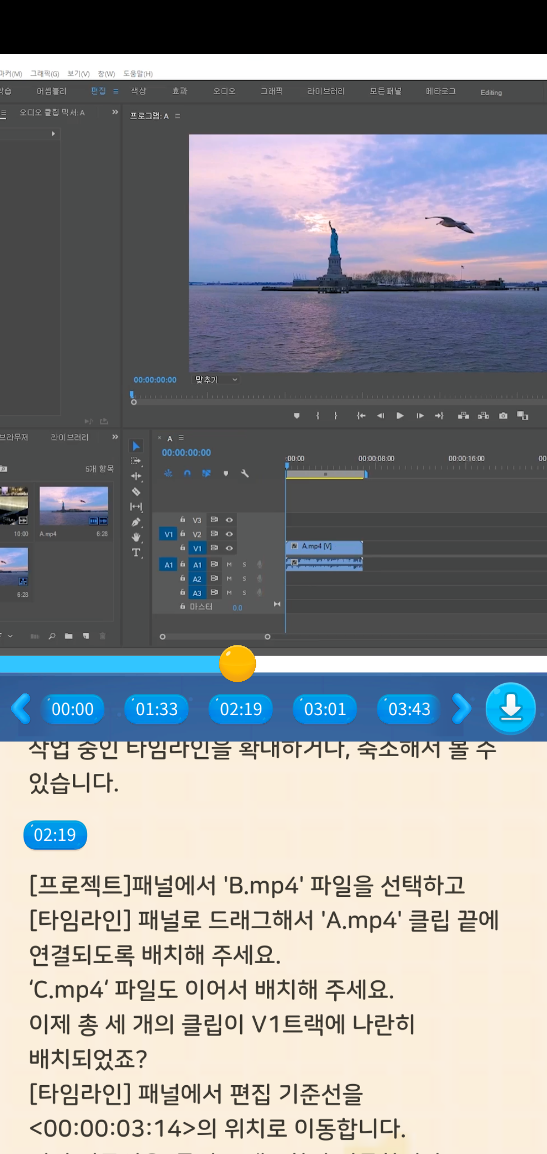 스마트폰이나 태블릿으로 수업을 들을 수 있어 언제 어디서나 배울 수 있다는 장점 외에도, 학습마다 줌 인, 줌아웃 그리고 해당 프로그램의 화면 그대로를 이용한 세세한 교육이 진행되어 하나씩 따라 배울 수 있는 조건이 무척이나 좋았던 점입니다. 같은 화면도 세로 모드 또는 가로 모드 선택이 가능해 원하는 형태의 화면을 바탕으로 학습이 가능합니다.