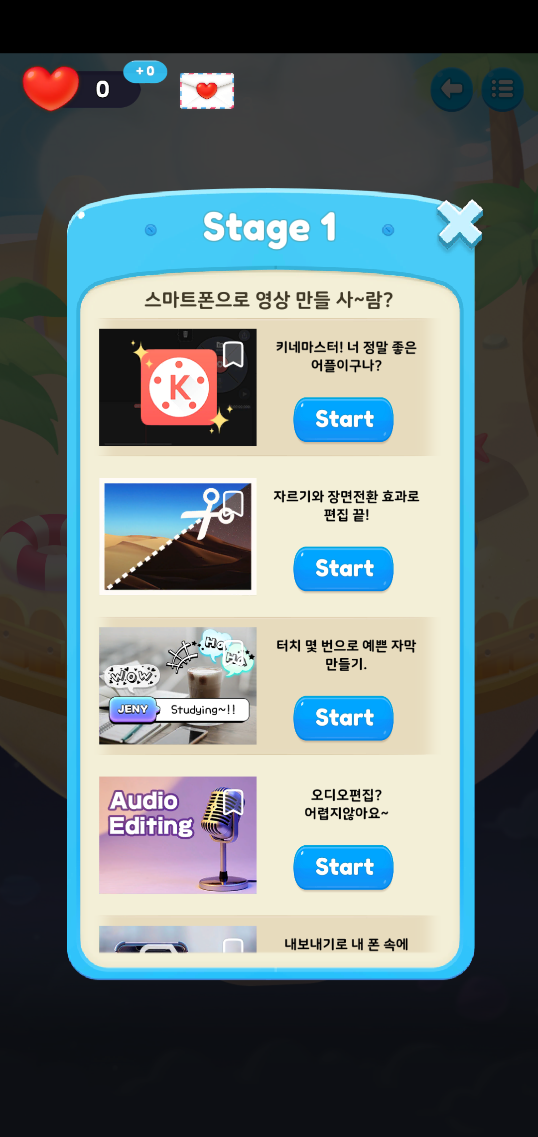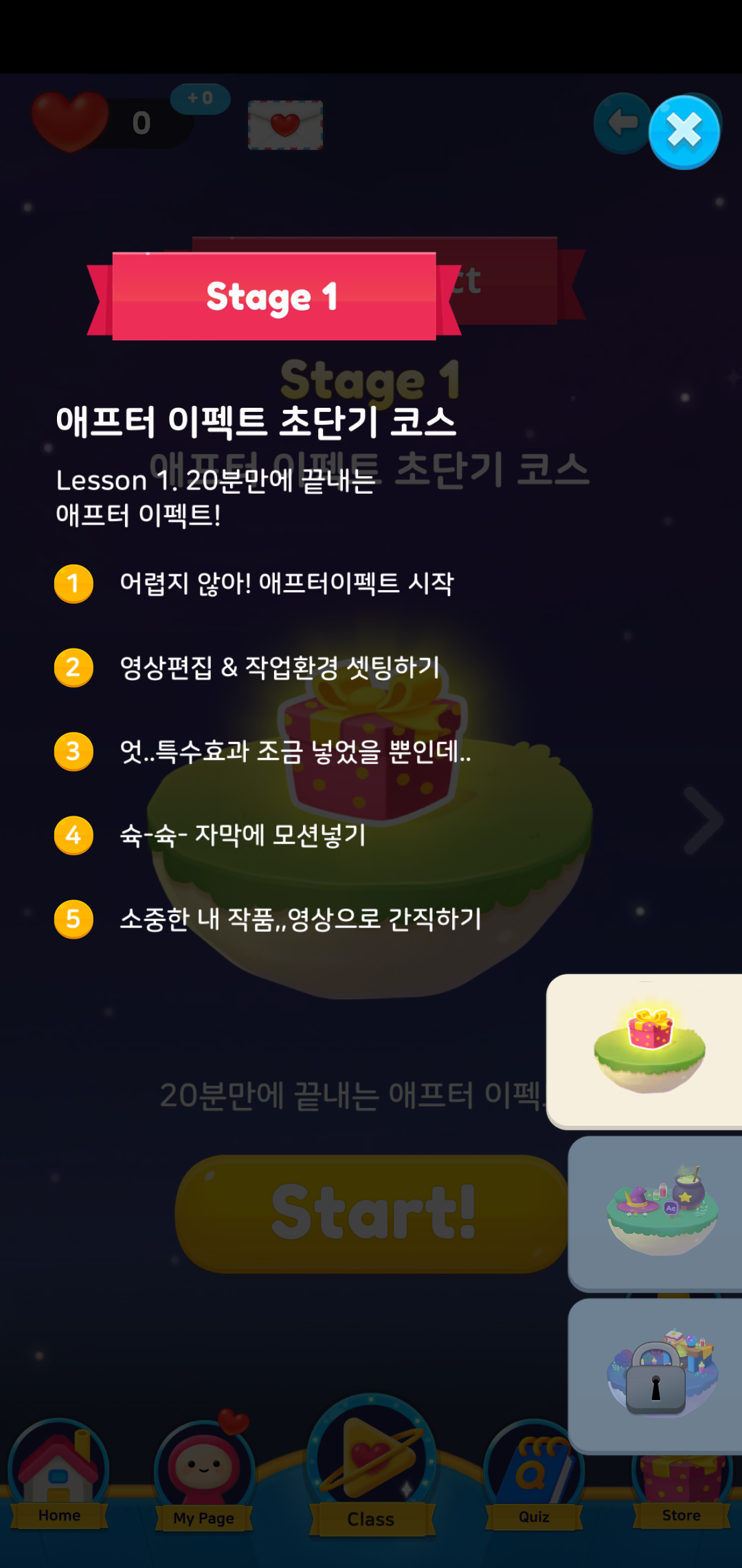 아임크리에듀에 처음 접속하면 튜토리얼을 통해 간략하게 사용 방법을 배우고, 원하는 수업을 시작할 수 있습니다. 애프터 이펙트부터 프리미어 프로, 키네마스터등 원하는 학습을 선택할 수 있어 단계별로 수업을 진행하게 됩니다. 수업은 복습과 퀴즈까지 이어져 어렵다는 느낌보다 재미있는 학습 게임을 하는 듯한 기분이 들어 더욱 집중할 수 있는 장점을 가지고 있기도 합니다.