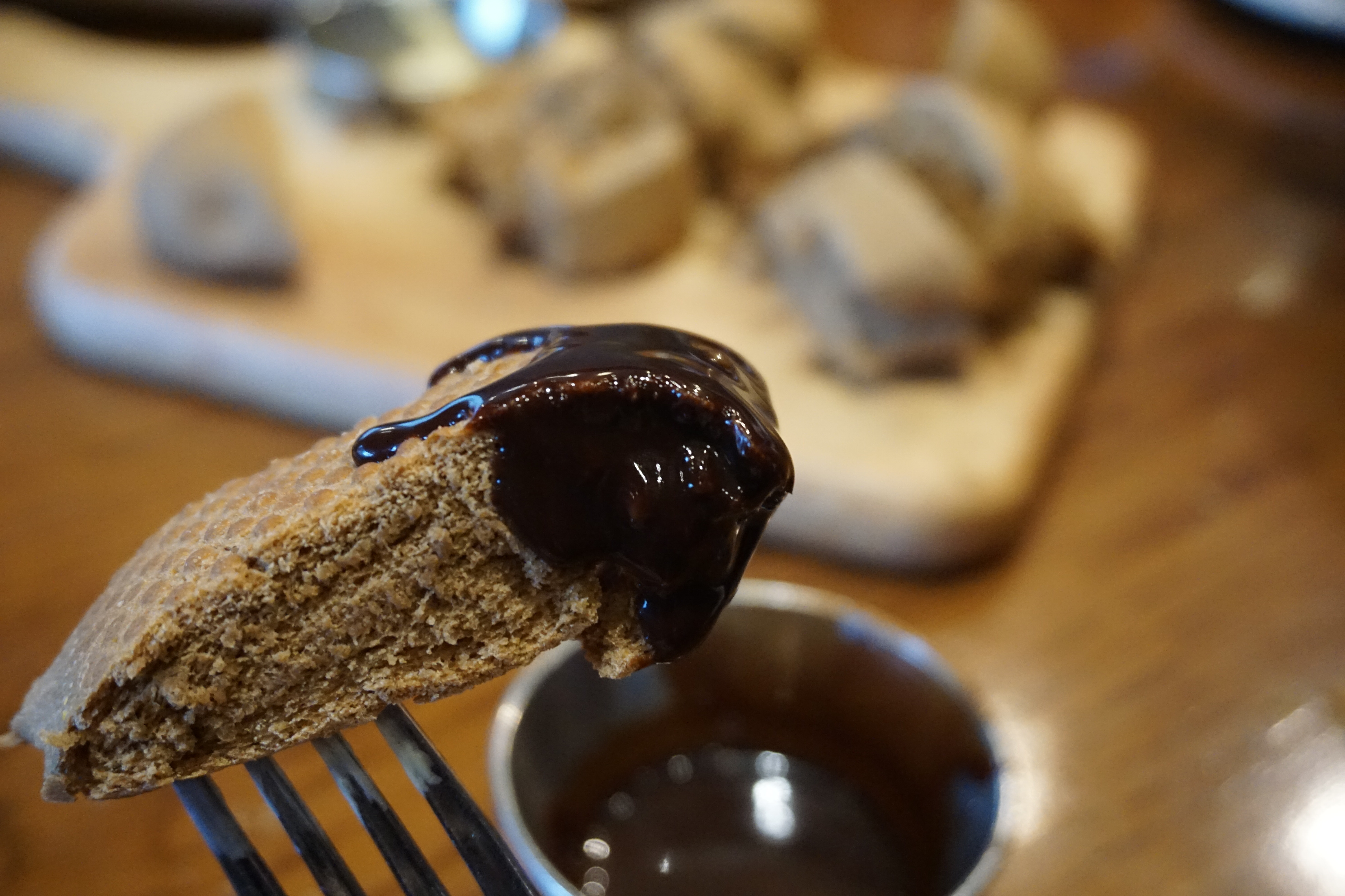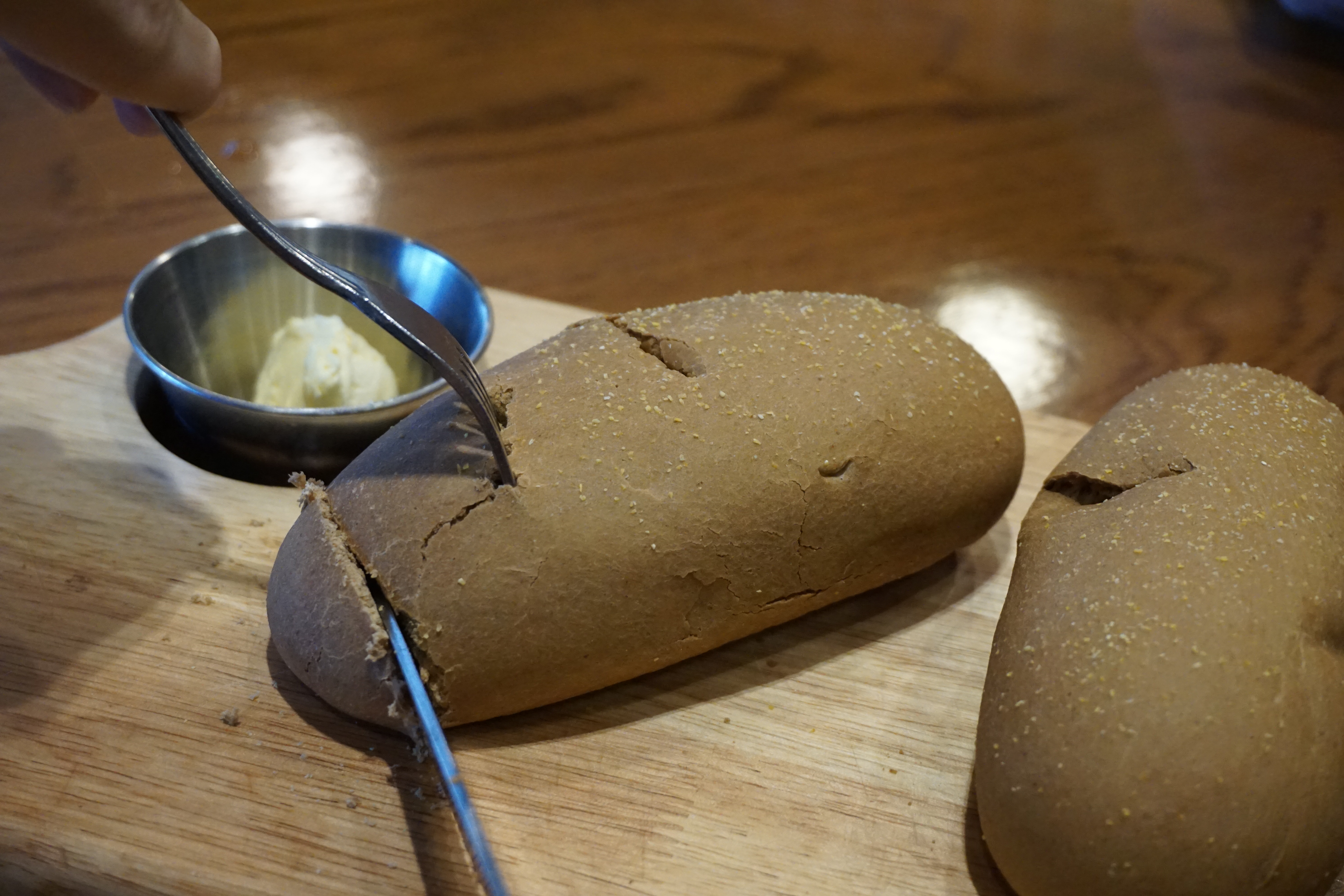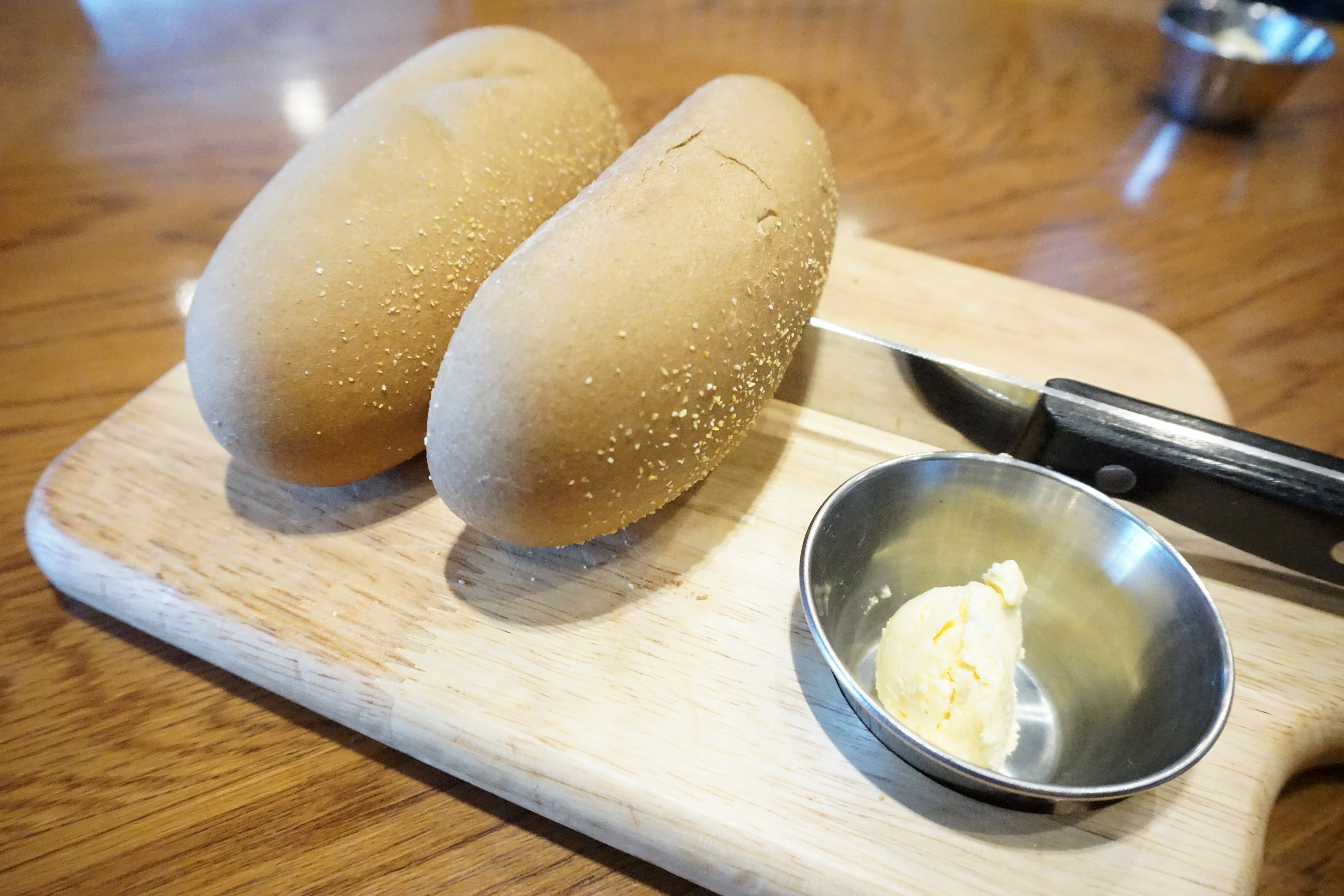 주문이 끝나자 식전빵으로 부쉬맨 브래드가 등장했습니다. 겉은 바삭하고 속은 촉촉해서 그냥 먹어도 좋고, 버터나 수프에 찍어먹어도 일품인데요, 부쉬맨 브래드에 기본으로 나오는 버터 외에 초코 시럽을 주문하면 별도의 비용 없이 추가할 수 있어서 초코시럽과도 함께 즐길 수 있었습니다.