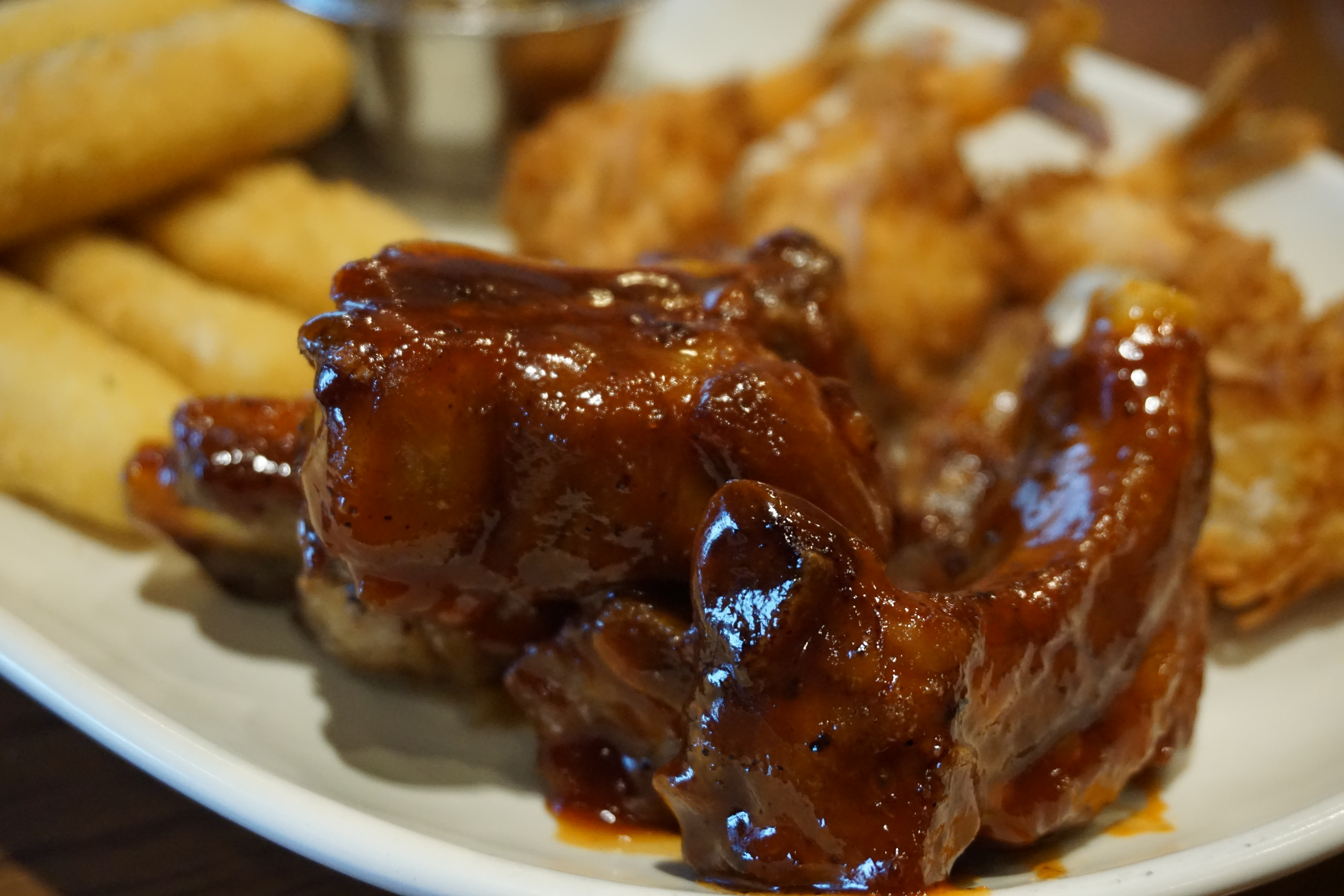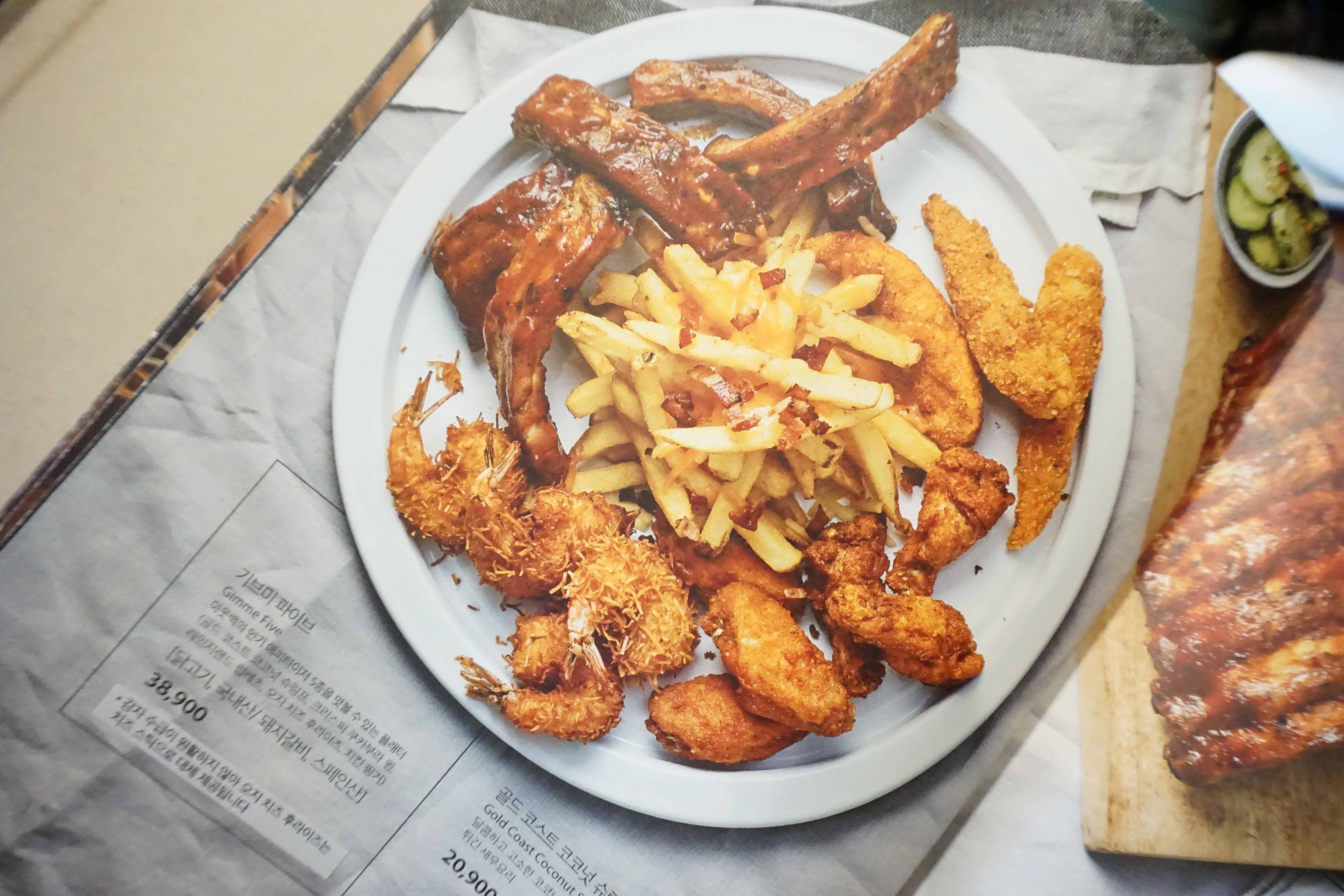 메인 메뉴들도 금방 준비되었습니다. 가장 먼저 기브미 파이브가 등장했는데요, 감자 수급이 원활하지 않아 오지 치즈 후라이 대신 치즈 스틱이 제공되어 있다고 공지되어 있어 괜찮을까 싶었는데 만족스러웠습니다. 먹음직스러운 백립부터 치킨너겟, 코코넛쉬림프, 윙봉까지 저녁시간엔 와인이나 맥주에 곁들여 먹기에도 좋을 것 같아요.