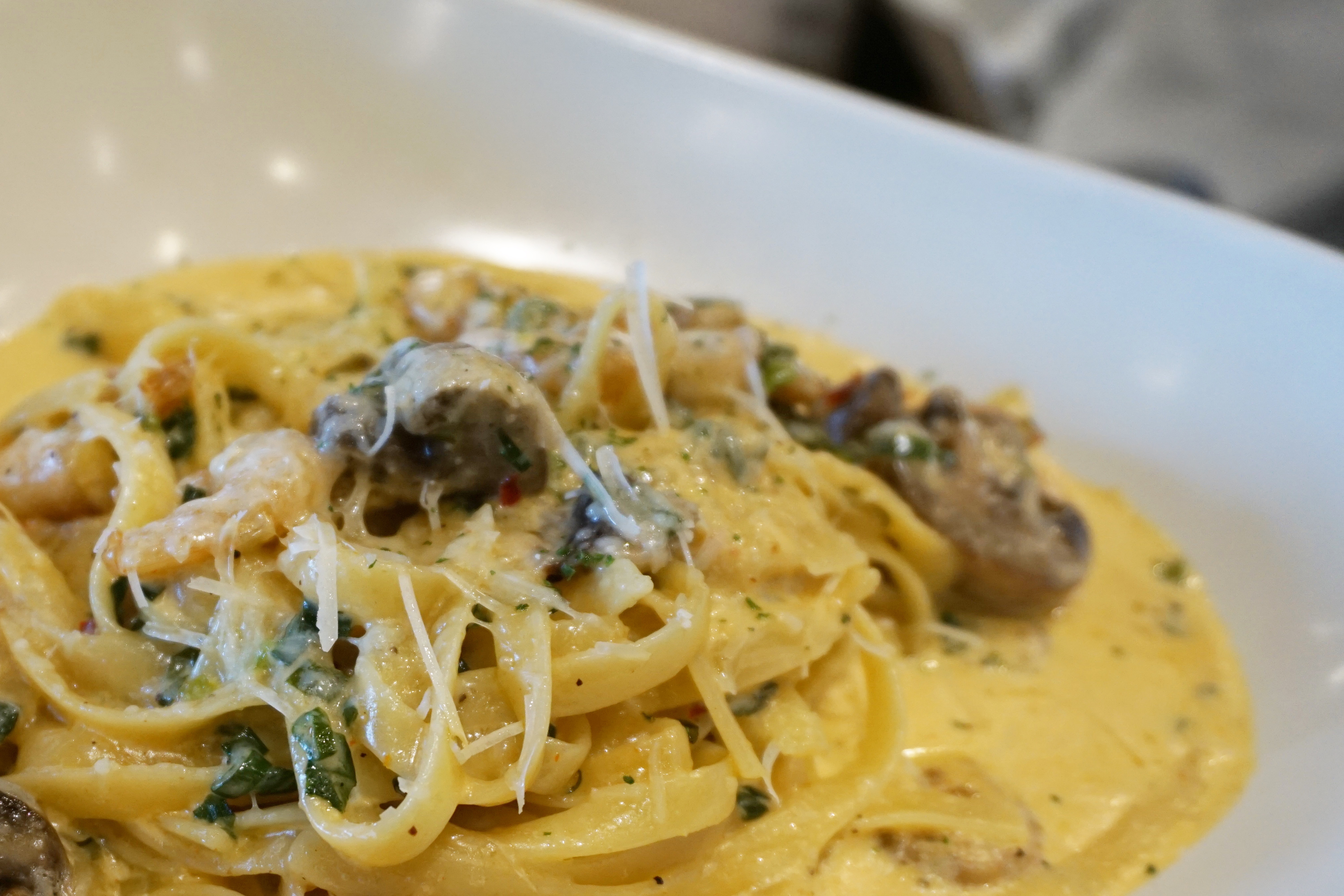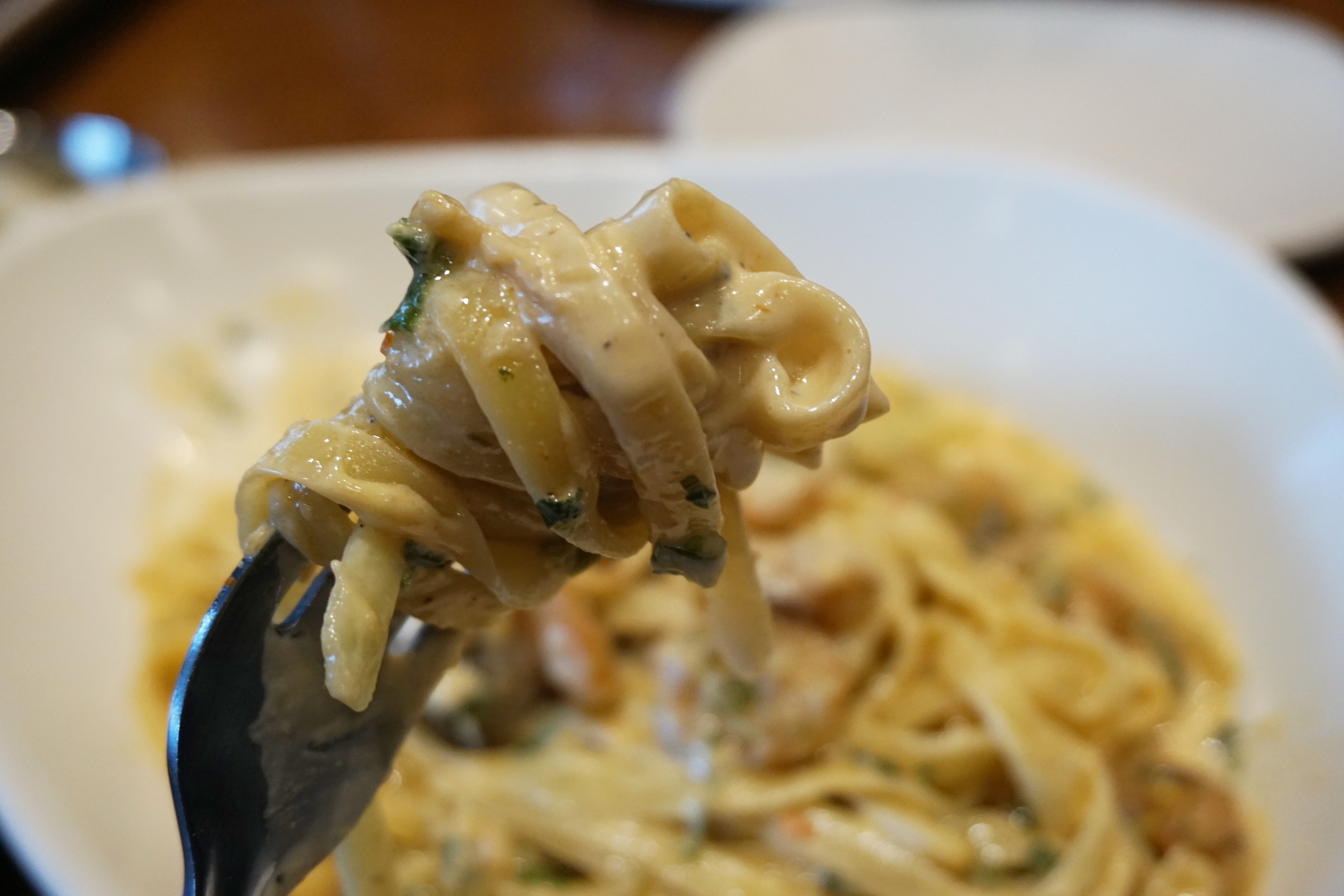 돌돌 돌려 먹는 재미까지 있는 투움바 파스타! 포크에 새우를 하나 끼워 면을 입혀 한입에 넣어주면 꾸덕한 소스의 맛과 파스타가 주는 식감과 탱글한 새우 식감이 더해져 입안에서 폭죽이 터지는 기분이에요. 여기에 양송이까지 더해지면 식감도 배가 된답니다.