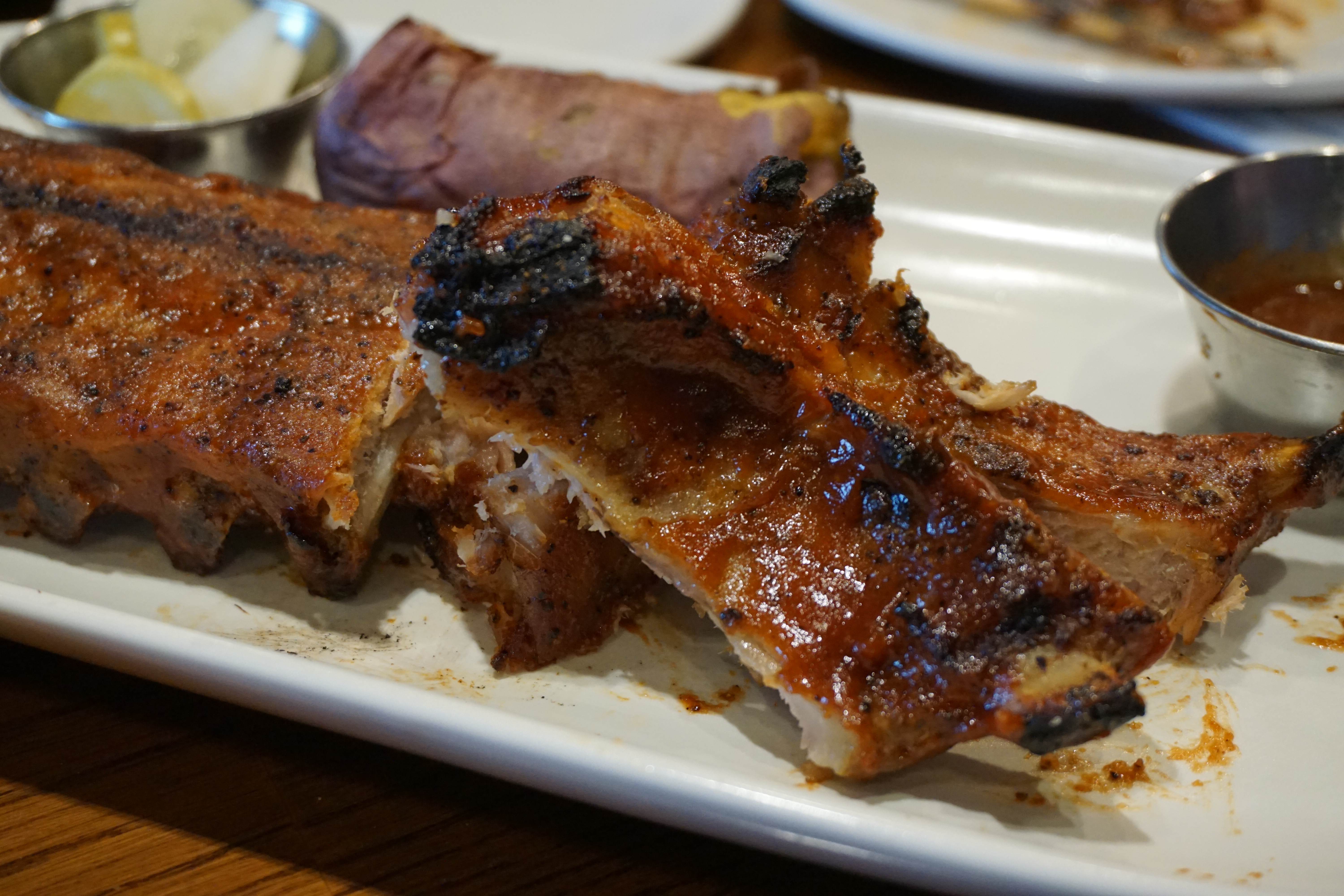 베이비 백립은 자를 때 주의할 점이 있는데요, 뼈가 일자가 아니라 약간의 커브가 있어 자를때 뼈를 따라 잘라야 중간 뼈에 칼이 부딪히지 않고 슥슥 잘 잘린답니다. 포크로 찍어 먹어도 좋지만 소스가 묻어도 손에 들고 추가로 준비된 소스에 푹 찍어 뼈에 붙은 살까지 발라먹는 맛과 재미는 웃음이 절로 나올 정도랄까요?