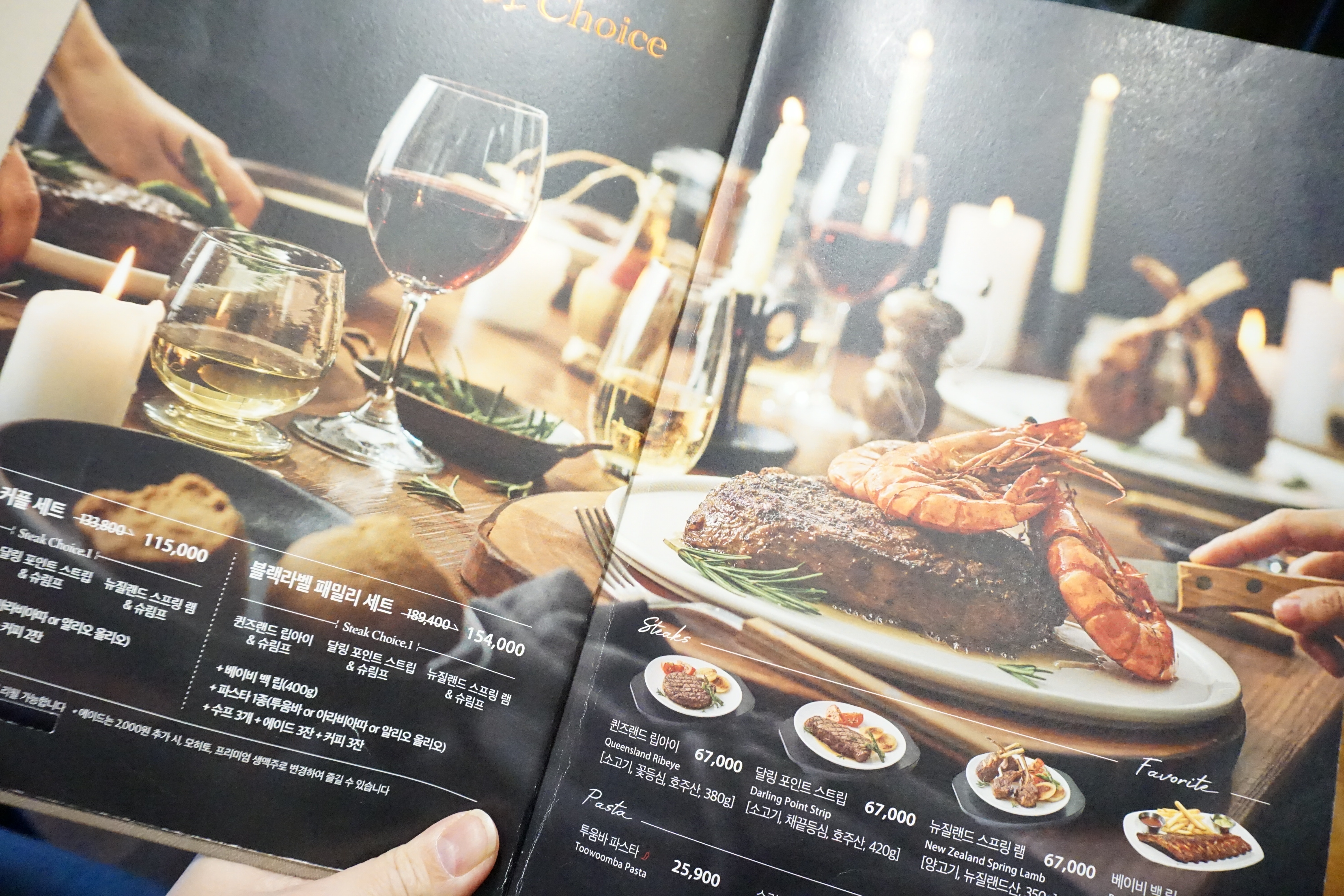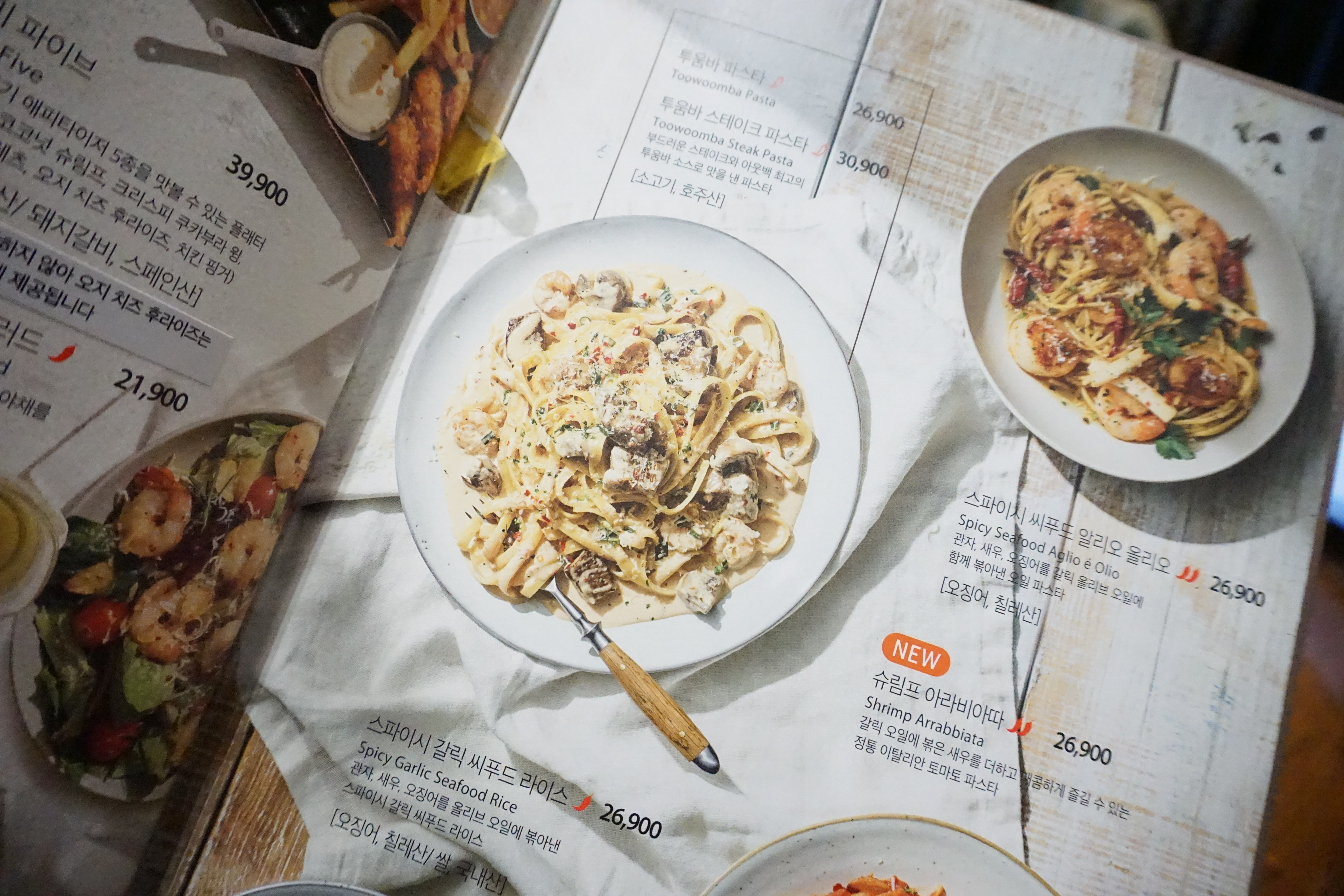 지인과 메뉴판을 보고 한참을 고민한 끝에 아웃백 메뉴 추천하면 빠지지 않는 투움바 파스타와 베이비 백립 그리고 기브미 파이브를 주문했습니다. 여기에 스테이크 덕후인 지인을 위한 달링 스트립 포인트 스테이크까지 먹고 싶은 메뉴는 다 주문한 것 같아요.