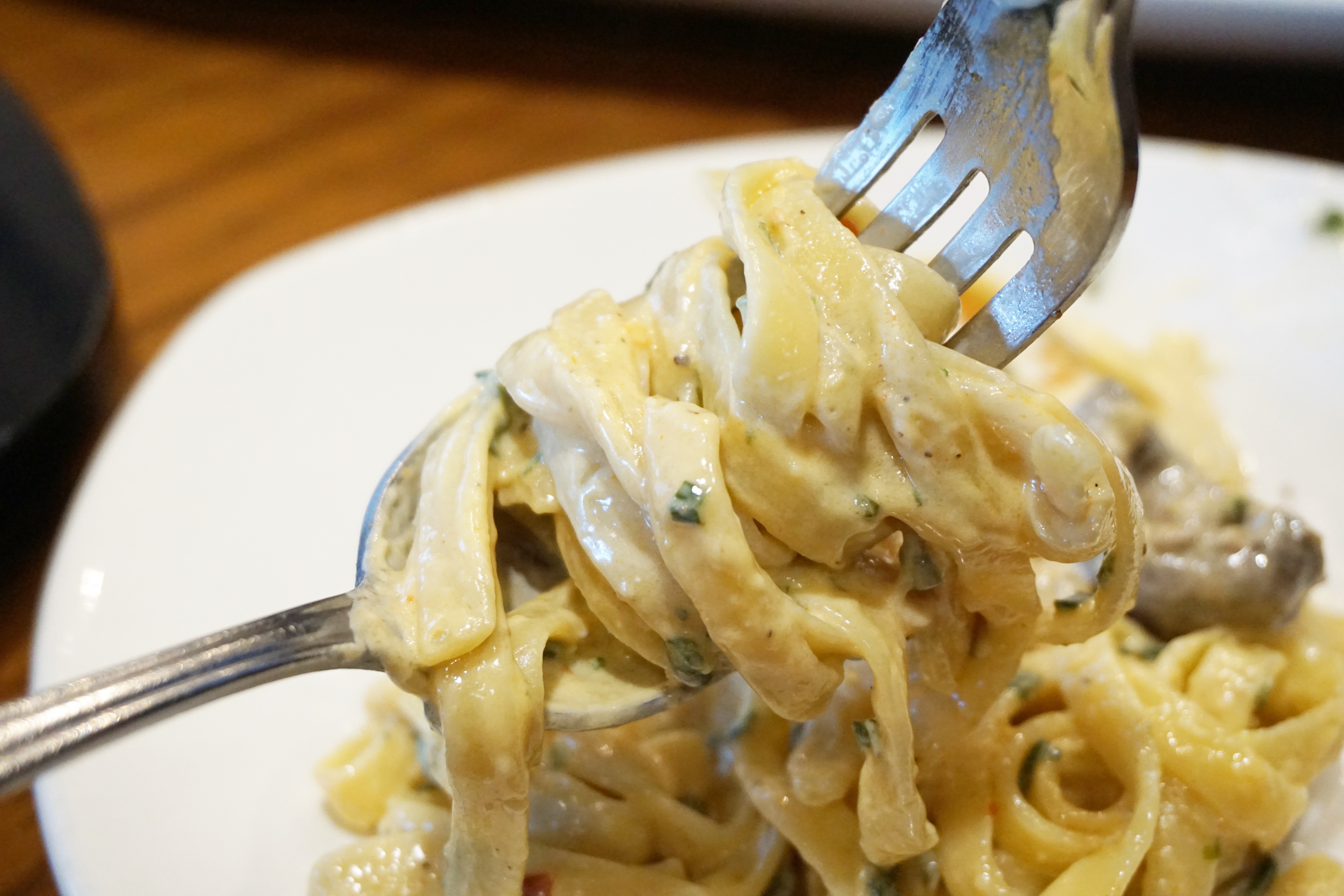 돌돌 돌려 먹는 재미까지 있는 투움바 파스타! 포크에 새우를 하나 끼워 면을 입혀 한입에 넣어주면 꾸덕한 소스의 맛과 파스타가 주는 식감과 탱글한 새우 식감이 더해져 입안에서 폭죽이 터지는 기분이에요. 여기에 양송이까지 더해지면 식감도 배가 된답니다.