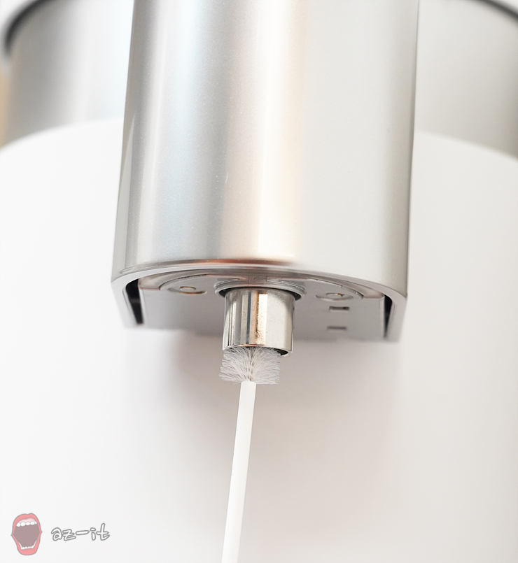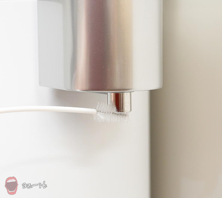출수구 청소의 경우 출수구 구멍 안쪽을 부드럽게 위아래로 10회 정도 움직여 청소해주고, 출수구 구멍 주변도 좌우로 10회 움직여 닦아주면 됩니다. 만약 커피나 차가 굳어 있다면 청소솔을 이용해 여러번 움직여 닦아주면 되는데요, 청소솔로 잘 안 닦아진다면 부드러운 칫솔과 소량의 따듯한 물을 이용하는 것도 좋습니다.