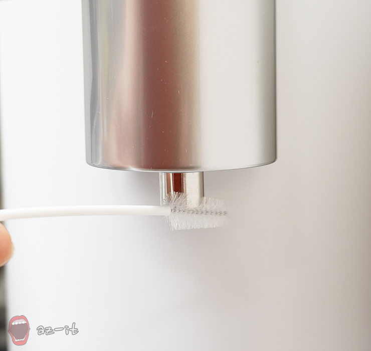 출수구 청소의 경우 출수구 구멍 안쪽을 부드럽게 위아래로 10회 정도 움직여 청소해주고, 출수구 구멍 주변도 좌우로 10회 움직여 닦아주면 됩니다. 만약 커피나 차가 굳어 있다면 청소솔을 이용해 여러번 움직여 닦아주면 되는데요, 청소솔로 잘 안 닦아진다면 부드러운 칫솔과 소량의 따듯한 물을 이용하는 것도 좋습니다.