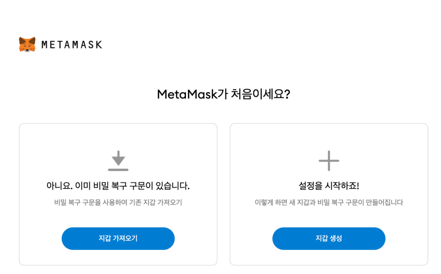 메타마스크 확장프로그램을 설치했다면, 프로그램을 활성화시켜야 합니다. 이후 지갑 생성을 클릭하면 비밀번호를 생성할 수 있습니다.