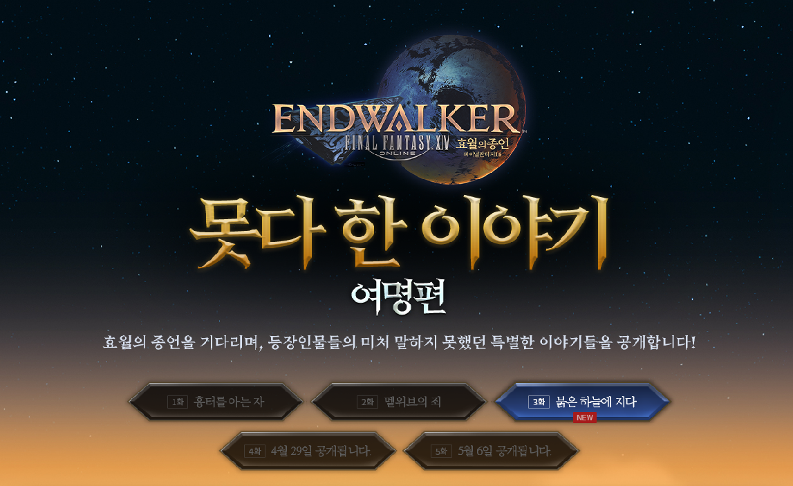 효월의 종언 확장팩을 기다리는 동안 등장인물들의 특별한 이야기를 확인할 수 있는 못다 한 이야기 여명편이 순차적으로 공개 중입니다. 등장인물들의 특별한 이야기를 한 편의 소설처럼 확인할 수 있어 효월의 종언을 기다리는 동안 읽어보면 좋을 듯합니다.