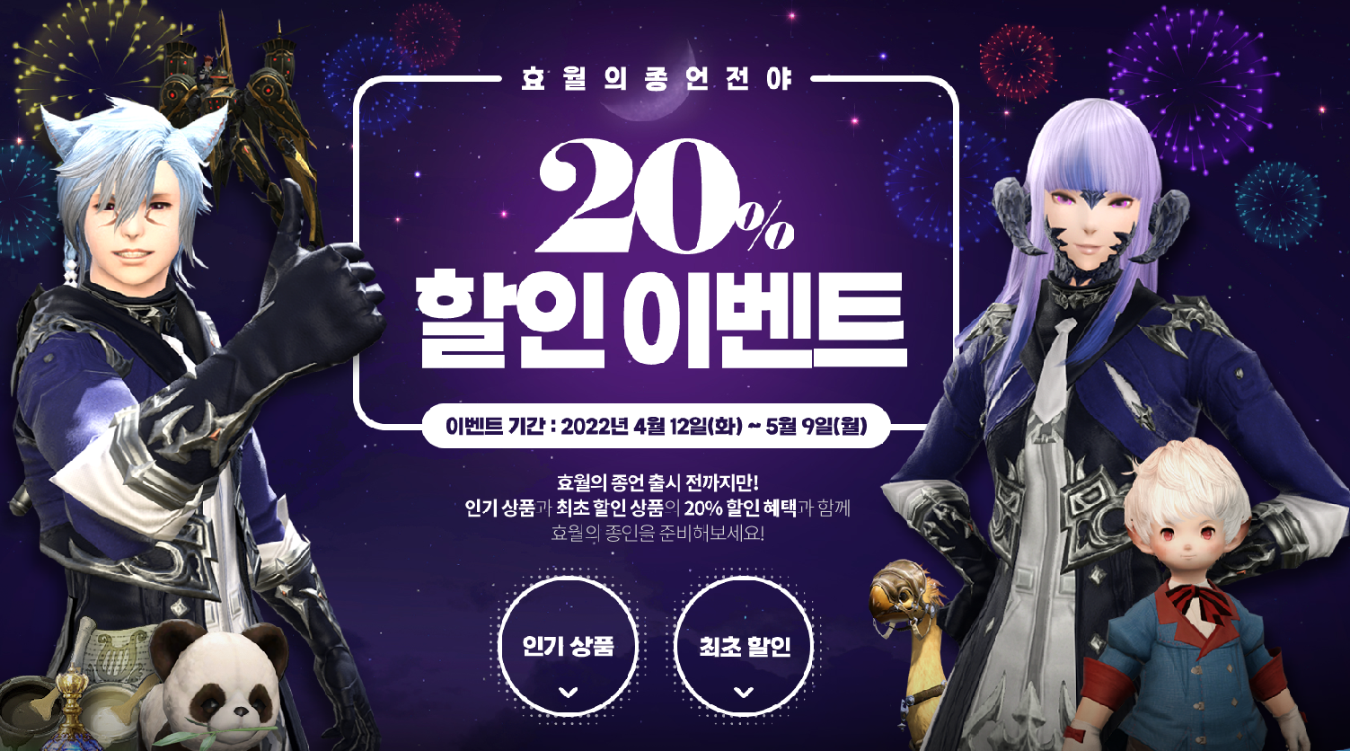 효월의 종언 전야 이벤트가 진행되어 5월 9일까지 인기 상품과 최초 할인상품의 20% 할인 혜택도 주어집니다. 환상약 묶음을 포함해 직업별 모험록: 홍련편, 홍련의 모험록이 해당되며 이외 집사 고용권, 순백색 염료, 영원의 서약 팔찌 등이 추가됩니다. 무엇보다 효월의 종언 전야제를 맞이해 순항 추격기 등의 아이템이 최초 20% 할인 혜택에 추가되어 할인된 비용으로 필요한 아이템 구입이 가능합니다.