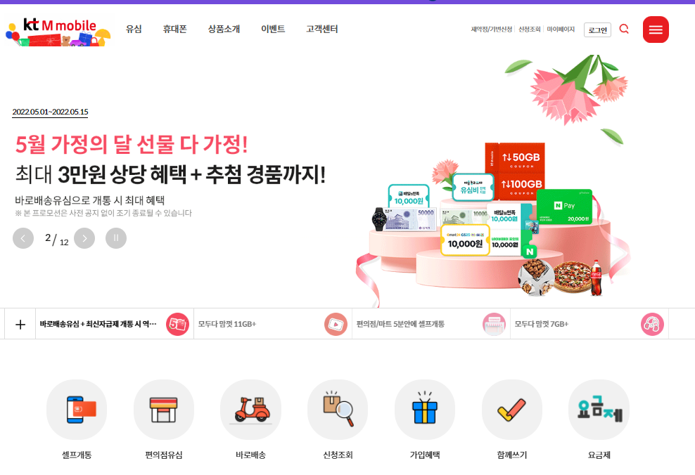 타 통신사보다 저렴한 비용으로 이용 가능한 kt엠모바일 가입은 대리점을 내방하지 않고, 셀프개통으로 보다 손쉽게 이용 가능한 점이 특징입니다. 셀프 개통 홈페이지를 통해 가입 신청서를 작성한 다음 집 근처에 위치한 편의점이나 kt엠모바일 공식 홈페이지 및 스마트 스토어 등에서 판매하는 유심을 구매하고 장착하면 셀프 개통이 완료됩니다.