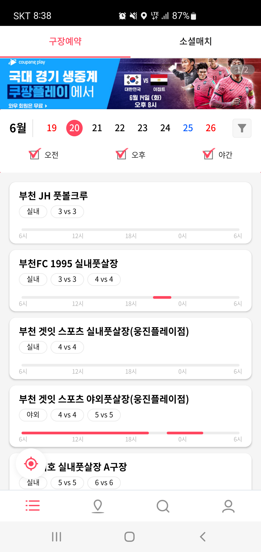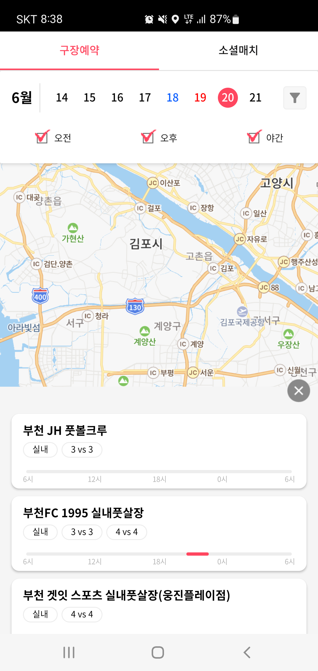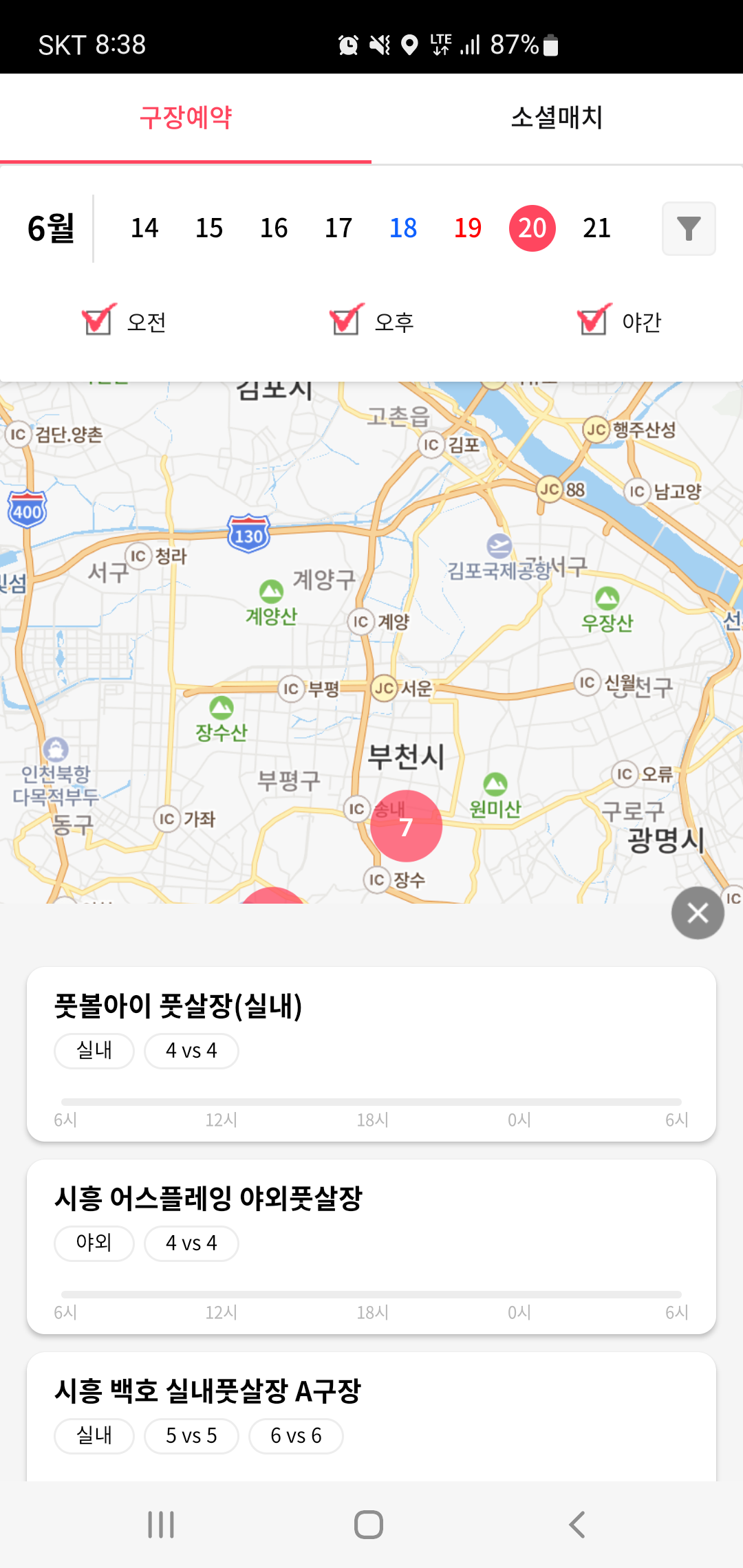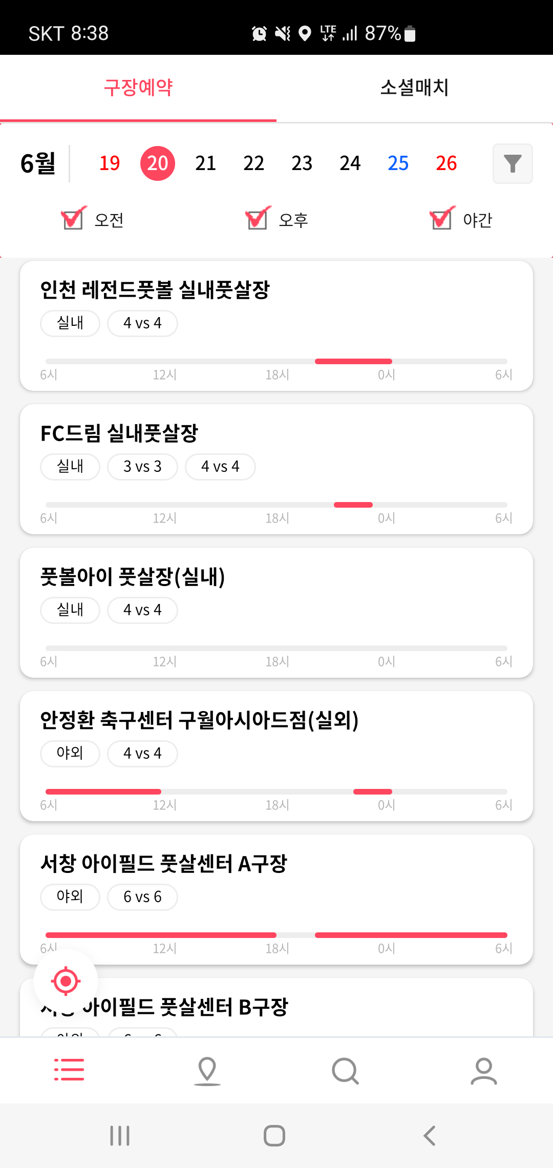 구장예약의 경우 오전/오후/야간으로 세부적으로 구분하여 일정별 원하는 구장 예약을 할 수 있습니다. 이때 일일이 구장을 선택하지 않아도 구장의 실내유무와 사용 가능한 인원수 및 이용가능한 시간대까지 한눈에 파악 할 수 있어 원하는 일정과 시간에 맞춰 구장을 선택이 가능합니다.