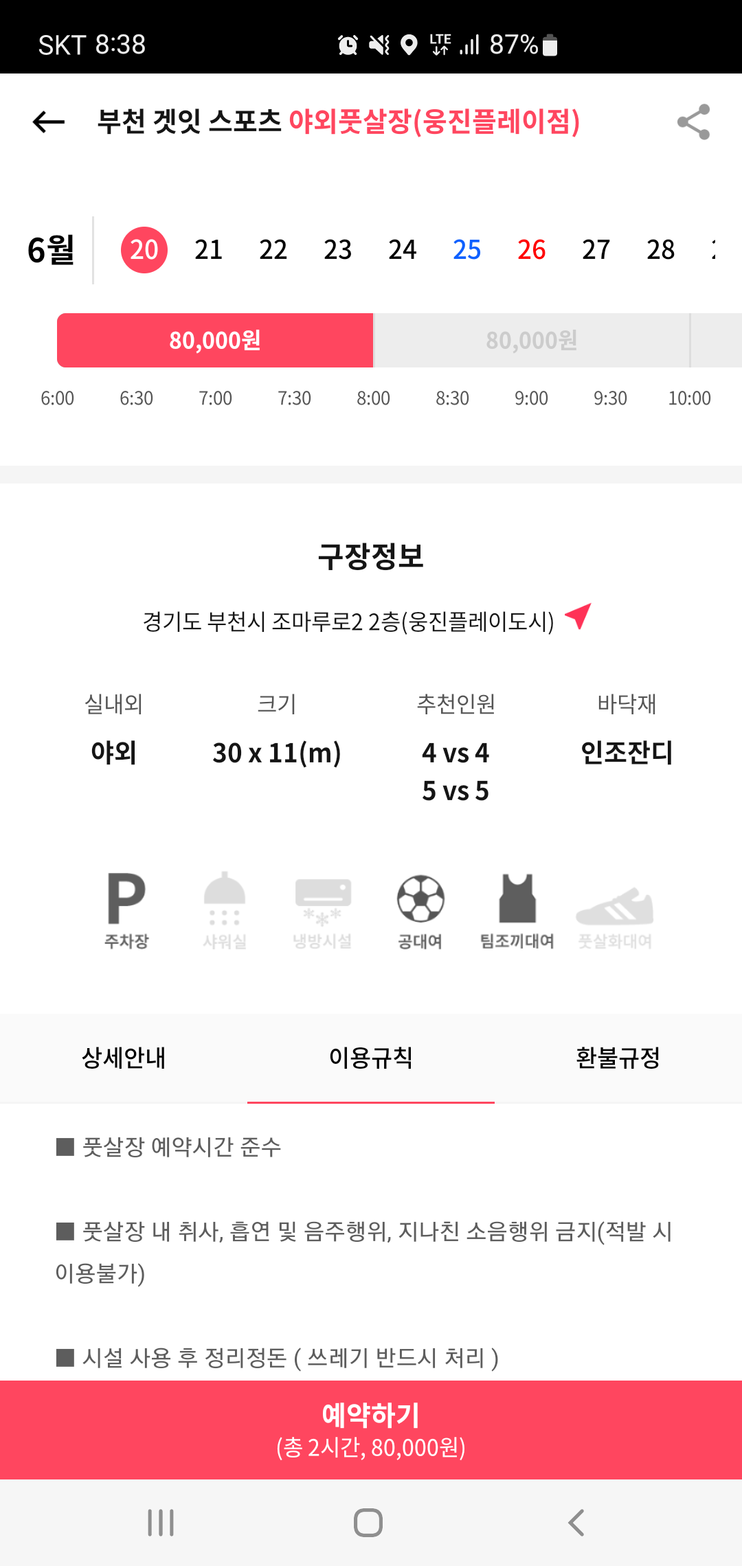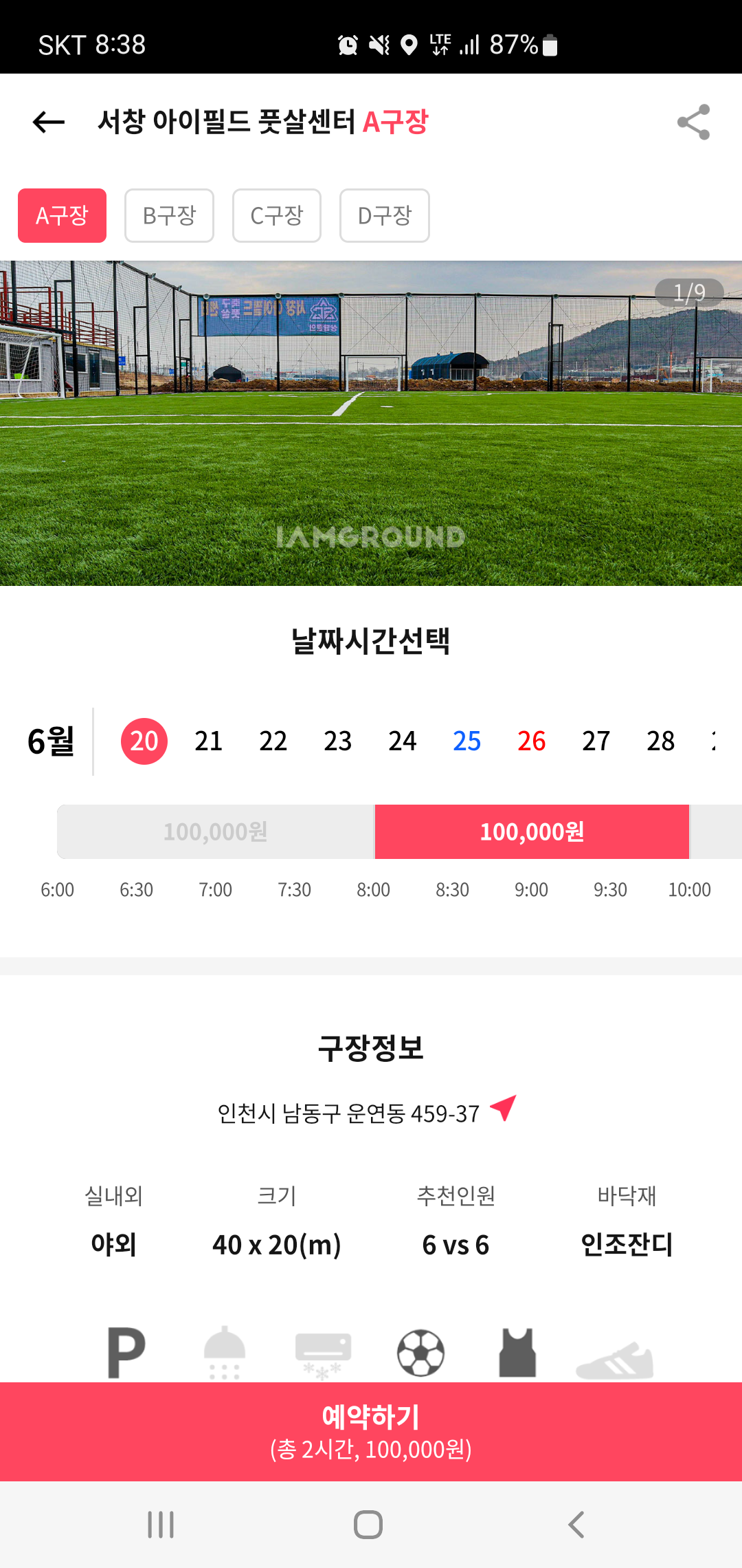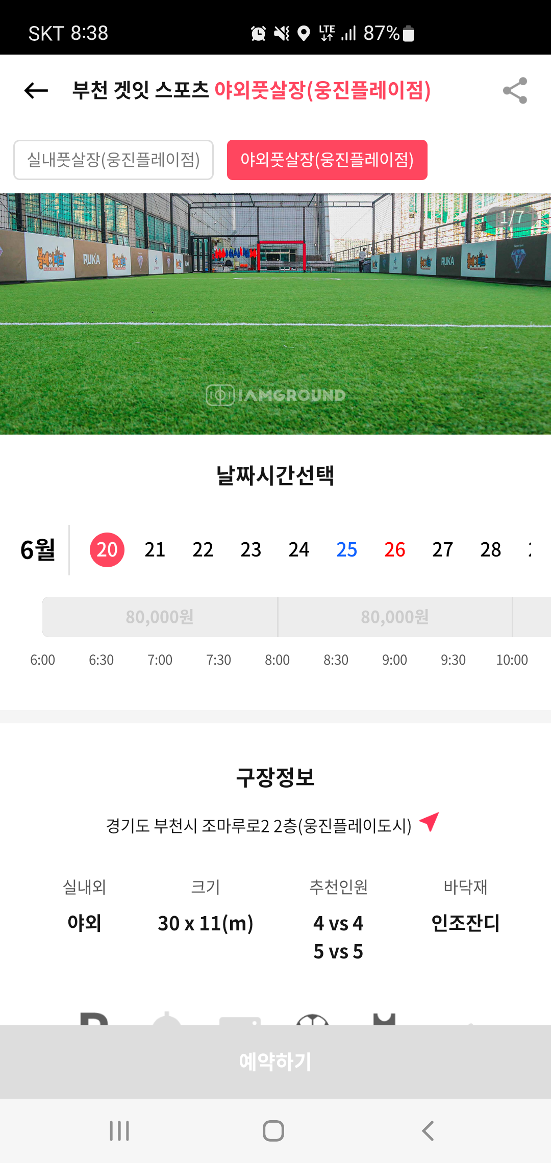 구장을 선택하면 구장 내부를 사진으로 확인할수 있고 구장위치와 특징을 확인할 수 있습니다. 또한 예약시 메인화면에서 선택한 날짜 외에도 원하는 날짜와 시간대를 선택가능하며 날짜와 시간시 이용비용 확인과 함께 예약도 바로 가능해 편리하게 예약할 수 있습니다.