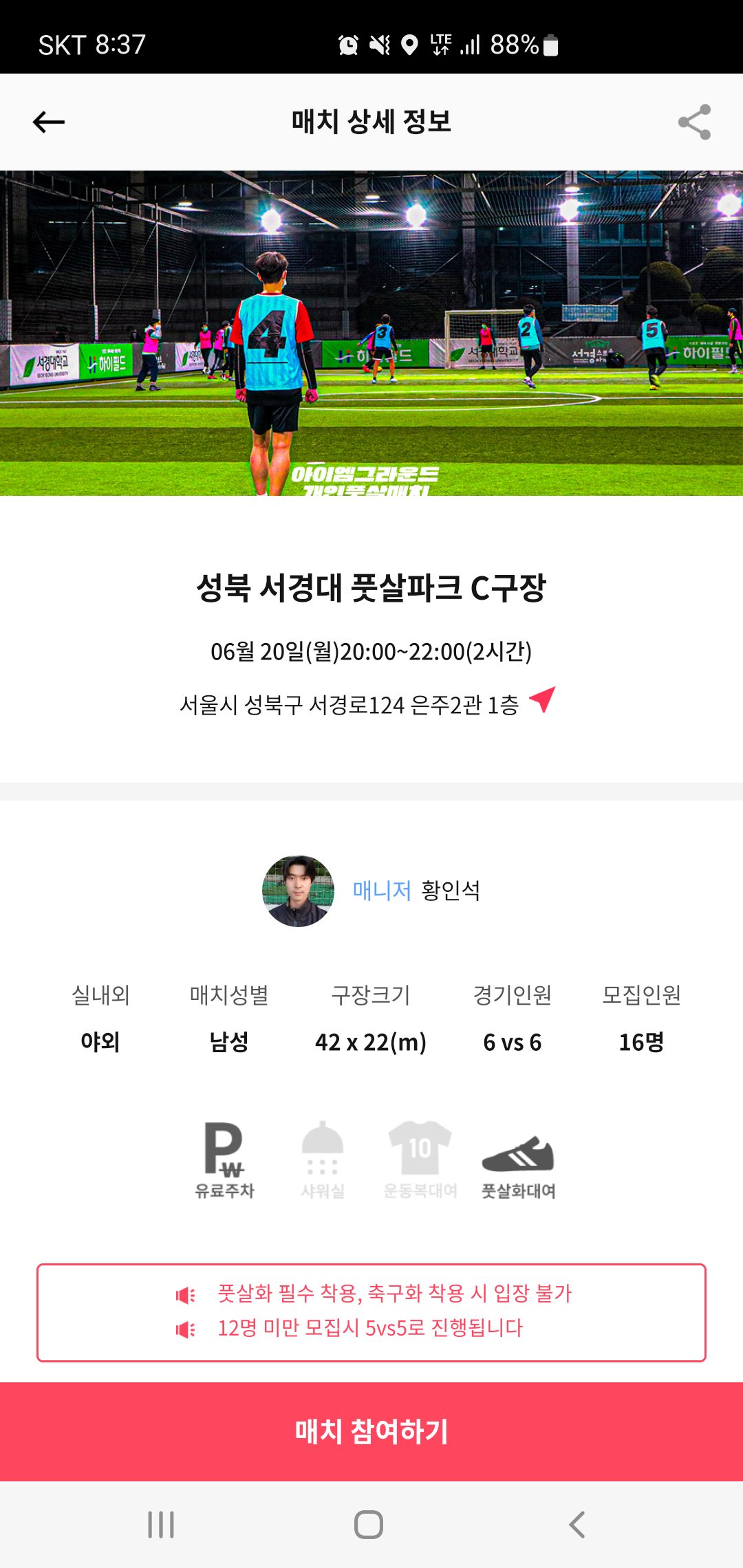 다만 풋살을 즐기기 위해서는 최소 인원이 필요한데요, 이제 막 시작하거나, 팀을 구성하기 어려운 분들은 최소 인원을 구성하는 것조차 어려워 고민하는 분들이 많으실꺼라 생각됩니다. 하지만 앞으로는 아이엠그라운드 풋살앱 하나면 보다 수월하게 풋살을 즐길 수 있을 것 같습니다.
