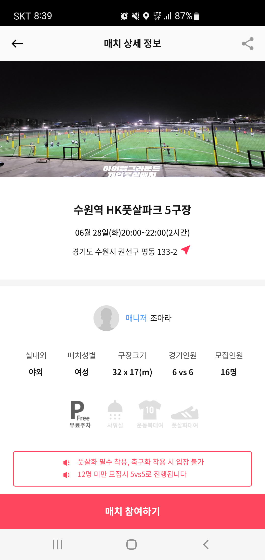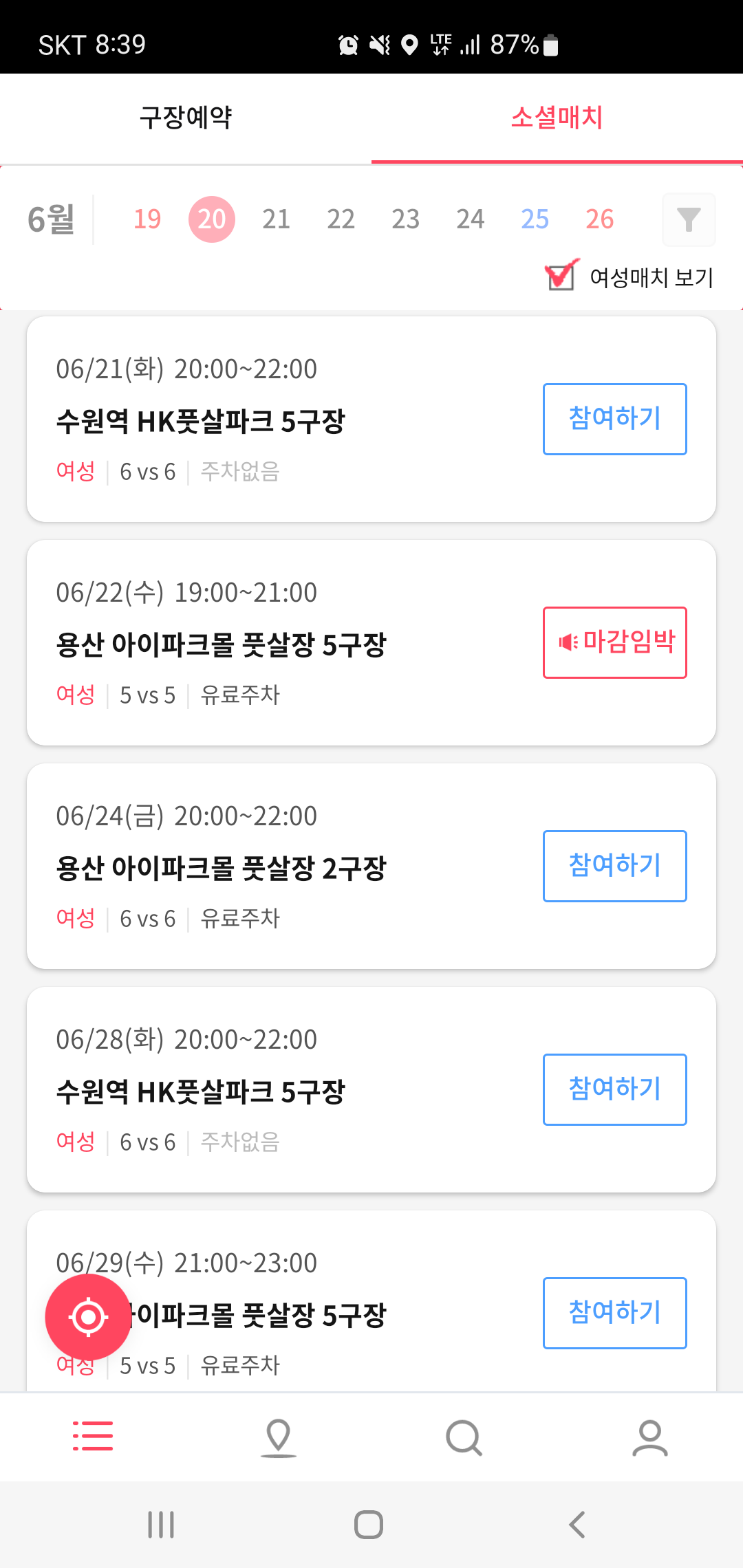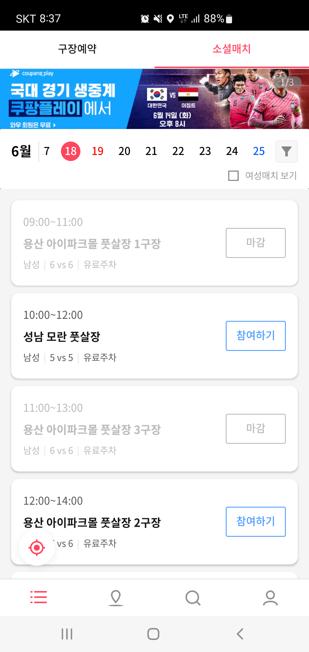소셜매치는 인원 모집부터 구장 확보, 매니저 배정에 이르기까지 진행에 필요한 모든 서비스를 제공해 원하는 구장과 날짜만 선택하면 참여할 수 있습니다. 무엇보다 매치 알람기능과 지역기반 매치 찾기가 준비되어 있고, 여성 매치도 따로 구분되어 구성되어 잇어 보다 편리하게 풋살을 즐길 수 있기도 합니다.