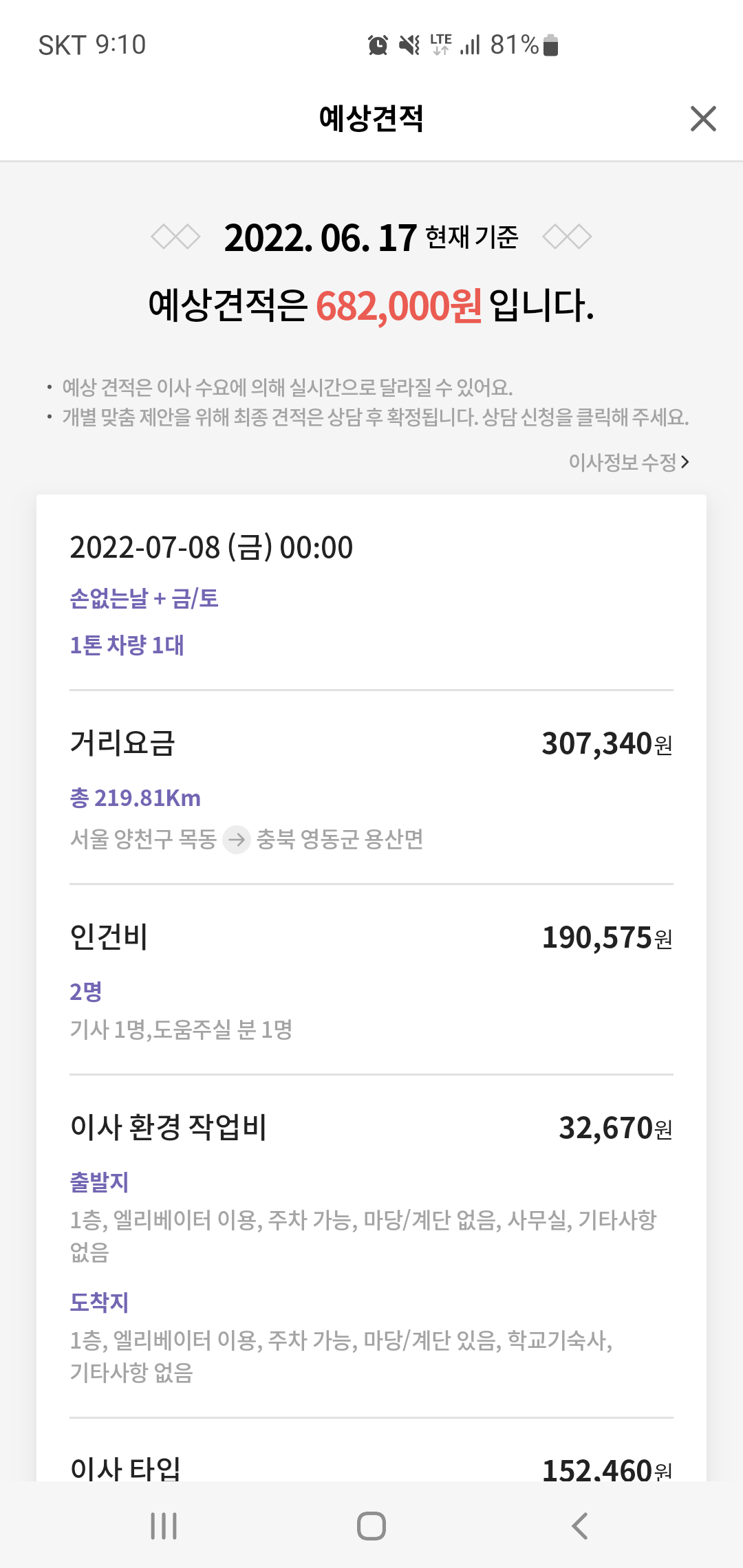캐리박스 앱을 이용하면 최종 예상 견적을 거리부터 인건비와 환경 작업비등 보다 자세한 내역으로 확인하고 계약을 진행할 수 있습니다. 이때 이사 수요에 따라 비용이 달라질 수 있다고 하니 이사 일정을 고려해 선택하는 것이 중요할 것 같습니다.