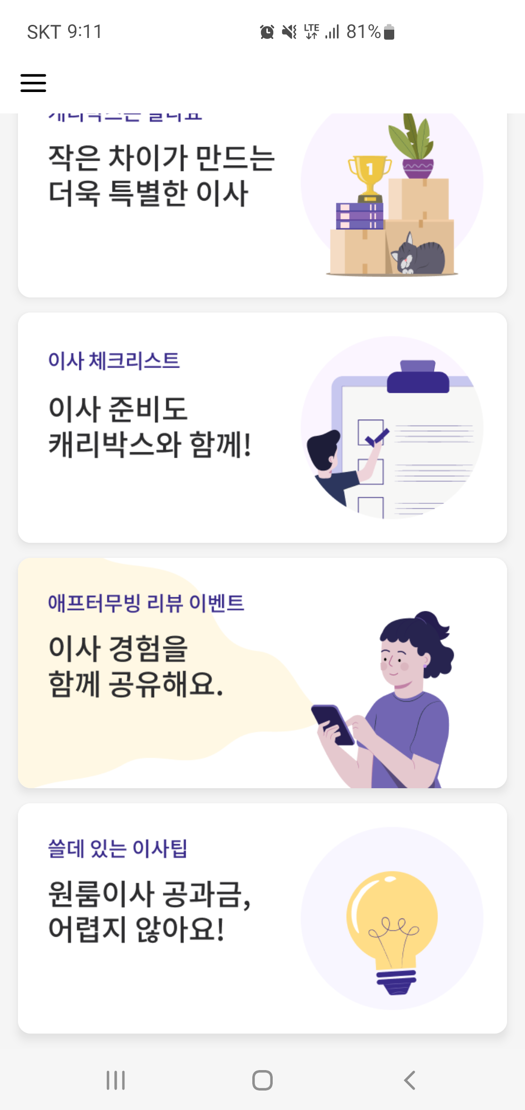 좋은 집으로, 새로운 보금자리로 이동하기 위해 꼭 필요한 이사를 준비하려면 신경 쓸 것들이 여간 많은 게 아닙니다. 가져갈 물건과 버릴 물건들을 정리하는 것도 필요하지만, 이사에 들어가는 비용을 알아보고 이사 업체를 선택하는 것도 쉬운 일이 아닌데요, 캐리박스를 이용하면 이사 비용을 빠르게 확인하고 예약까지 가능해 보다 편라한 이용이 가능합니다.