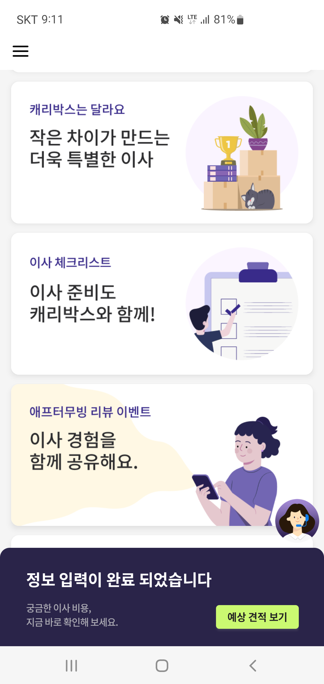 매번 이사업체마다 연락해 어느정도 견적이 나오는지, 원하는 일정에 이사가 가능한지 여부를 물어봐야 했던 번거로움을 캐리박스를 이용하면 기다릴 필요 없이 바로 견적을 확인하고 예약과 결제까지 진행할 수 있습니다.