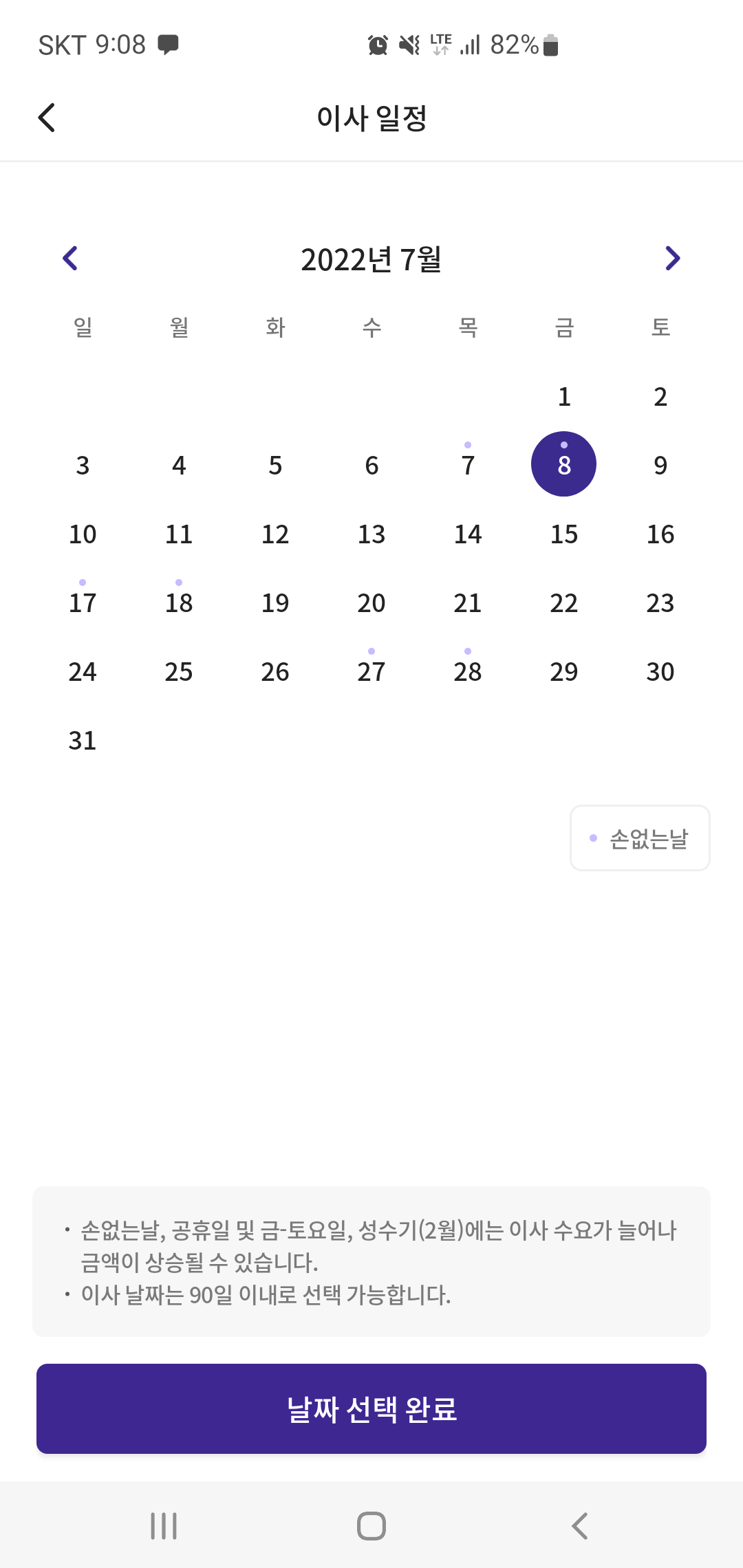 이사 날짜는 90일내로 선택 가능하며, 손 없는 날을 일일이 체크하지 않아도 확인 가능합니다. 단, 손 없는 날을 포함해 공휴일 및 금~ 토요일 그리고 성수기인 2월에는 이사 수요가 늘어나 금액이 상승될 수 있어 참고하여 설정하면 됩니다.