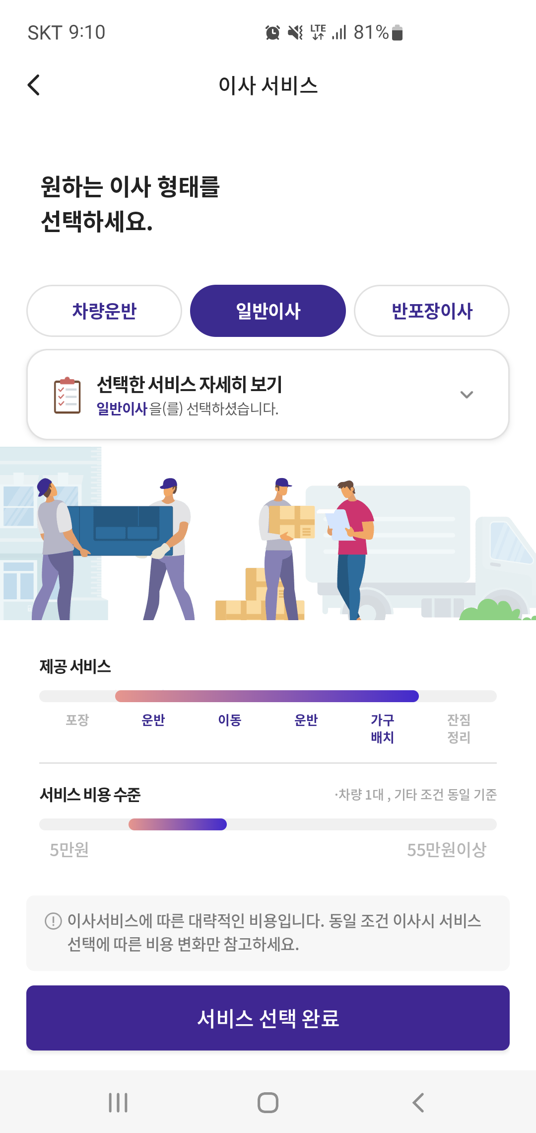 마지막 단계는 이사 형태를 결정하는 부분입니다. 단순 차량 운반으로 진행할지, 일반이사 또는 반포장 이사 중 원하는 방식으로 선택할 수 있습니다. 현재 포장이사와 추후 보관 서비스는 선택이 어려운데요, 곧 오픈된다고 하니 사용에 불편함은 없을 것으로 예상됩니다.