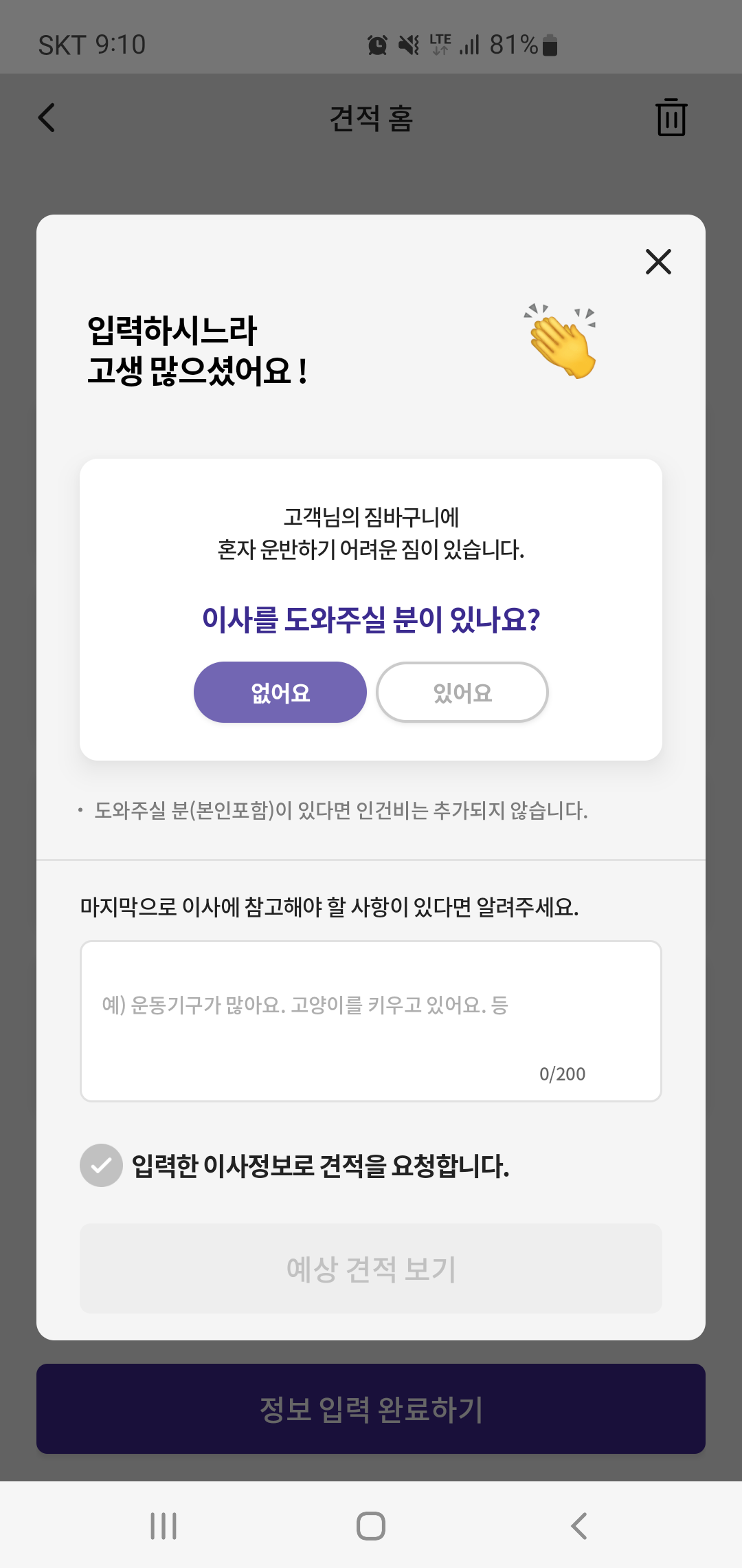 모든 선택이 마무리 된 후 이사를 도와줄 사람이 있는지 여부와, 이사에 참고할 사항들을 입력하면 최종 견적을 받을 수 있습니다. 캐리박스와 함께 하는 파트너사의 경우 10년 이상 원룸 전문가라고 하니 이사를 하는데 불편한 상황이나 불미스일에 대한 부분은 크게 걱정하지 않아도 될것 같습니다.