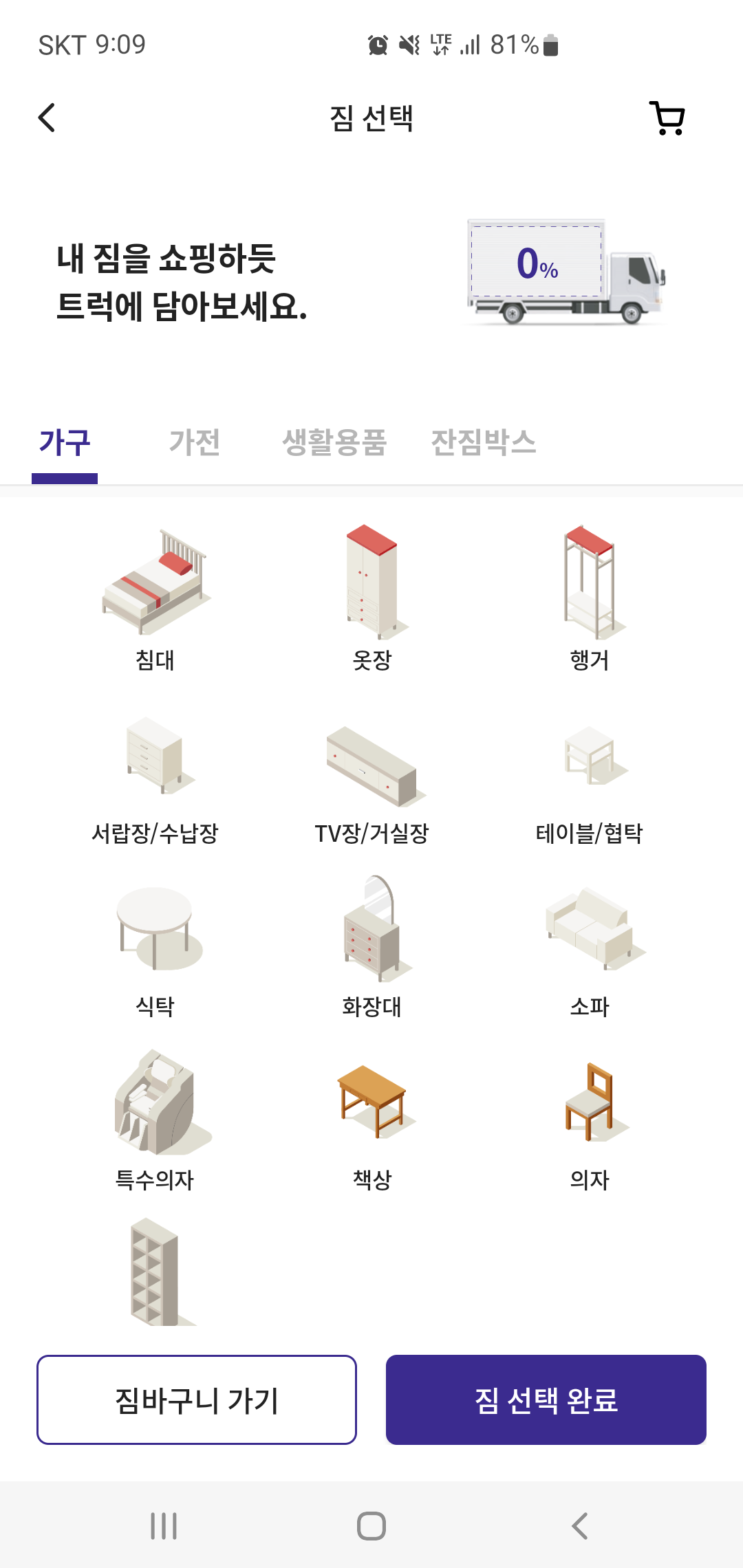 출발지와 도착지에 대한 정보 기입이 마무리 되면 이사를 통해 이동해야 하는 짐을 선택하게 됩니다. 짐 선택은 일일이 기재할 필요 없이 목록을 보고 해당하는 물건들을 쇼핑하듯 선택하면 되는데요, 선택한 짐에 따라 차량 공간과 이사 차량 수까지 바고 확인할 수 있어 편리합니다.