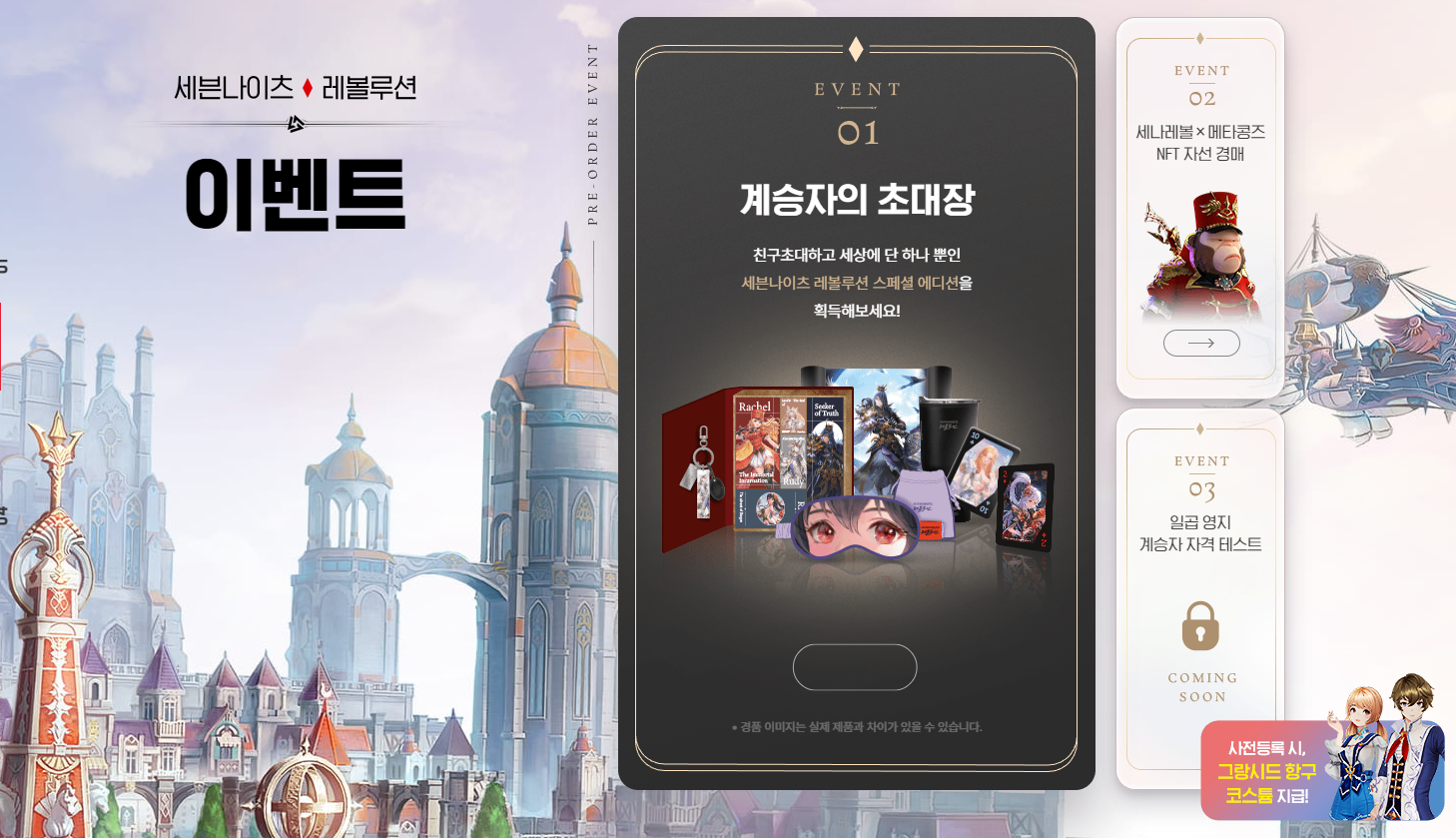 사전등록가 함께 진행되는 특별한 이벤트도 풍성하게 열리는 중입니다. 친구를 초대하고 세상에 단 하나뿐인 세븐나이츠 레볼루션 스페셜 에디션을 획득할 수도 있고, 세나레볼과 메타콤즈하 함께 하는 NFT 자선경매 참여도 가능합니다. 이외에도 일곱 영지 계승자 자격 테스트도 곧 진행된다고 하니 잊지 말고 참여해 풍성한 선물의 주인공이 되어보시기 바랍니다.