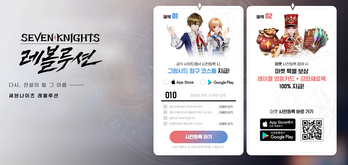세븐나이츠 레볼루션 정식 오픈을 앞두고 사전예약이 한창 진행 중입니다. 핸드폰 번호만 입력하면 누구나 손쉽게 참여 가능하고, 공식 사이트에서 사전등록에 참여하면 그랑시드 항구 코스튬이 지급됩니다. 또한 마켓 사전등록에 참여하면 레이첼 영웅카드와 강화재료팩을 100% 지급한다고 하니 꼭 챙겨두어야 할 것 같습니다.