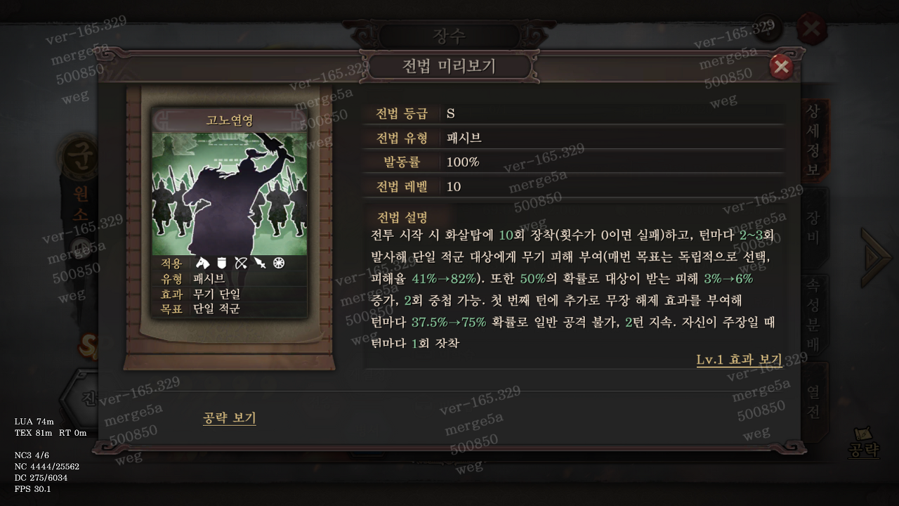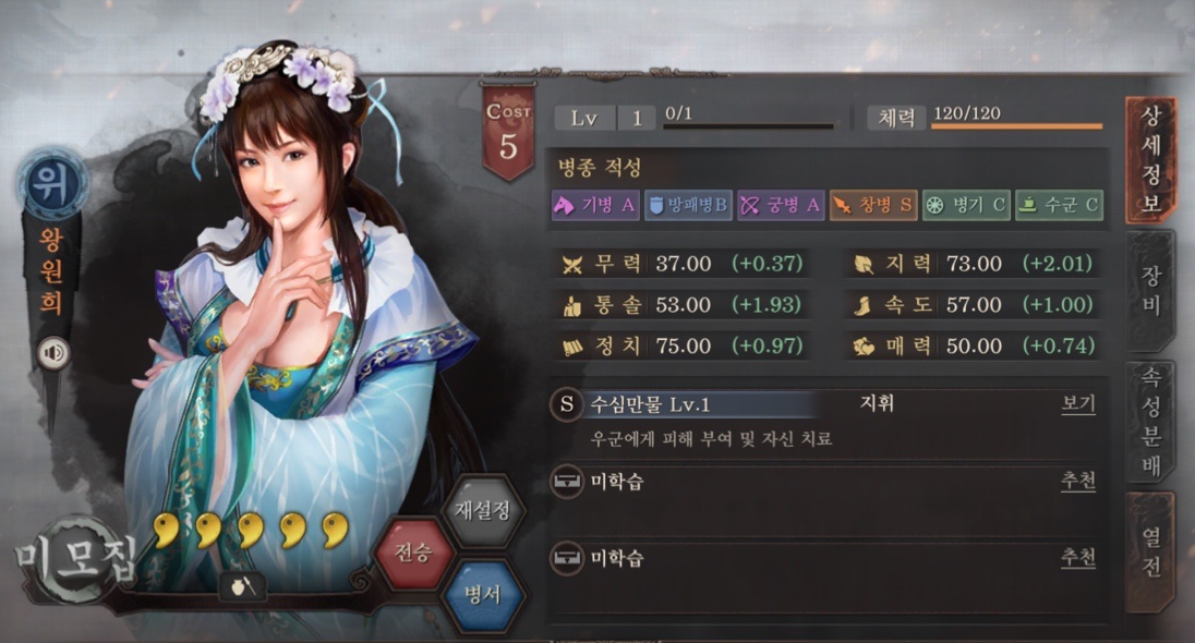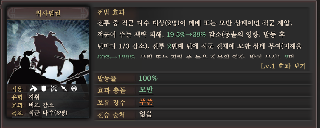 전승전법 유리한 기회도 추가되었습니다. 왕원희와 SP 주준의 전법전승으로 획득 가능한 전법으로, 제어와 공격력을 겸비한 점이 특징입니다. 또한 용맹한 사수와 비교했을 때 무기 공격이 추가된 점이 특징으로 태사자나 장료 같은 돌격 장수에 매칭 가능합니다.