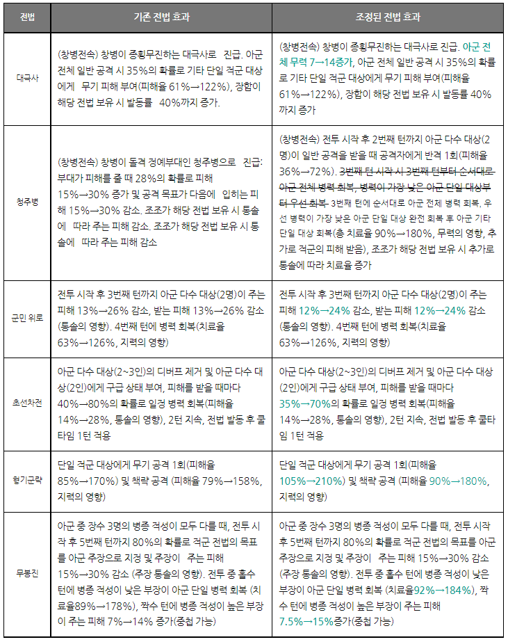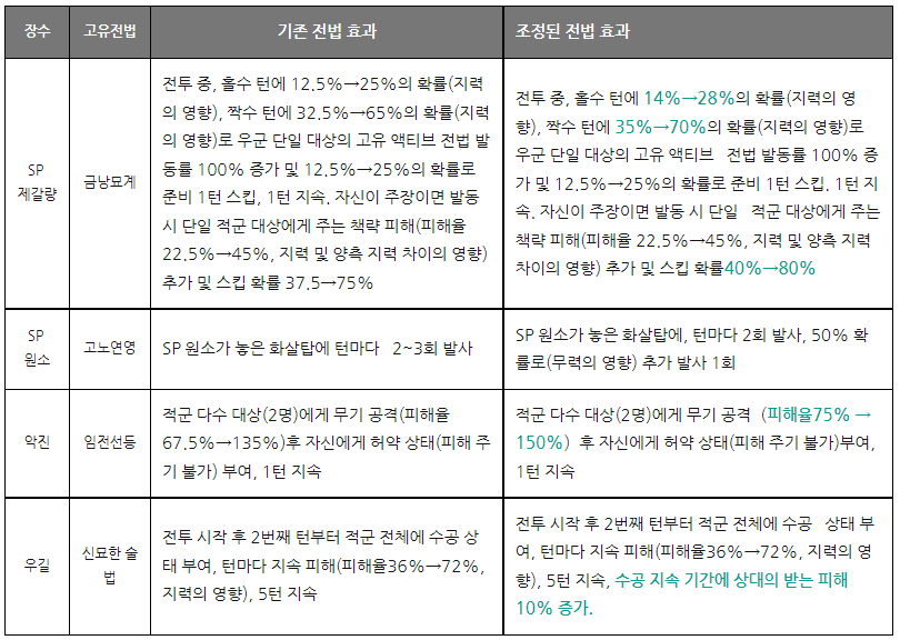 SP 제갈량 금낭묘계 전법의 경우 기존 전법 효과에서 전법 발동 확률이 증가하였고, SP 원소 고노연영 전법의 경우 50% 확률에 따른 추가 발사 1 회가 포함되었습니다. 또한 약진 전법의 경우 무기 공격 피해율이 증가하였고, 우길의 신묘한 술법 전법에 있어 수공 지속 기간에 상대의 받는 피해가 10% 증가합니다.
