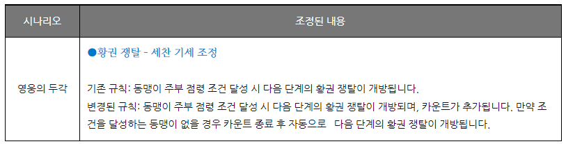 시나리오 규칙 밸런스도 조정되었습니다. 영웅의 두각 시나리오의 경우 황권 쟁탈 - 세찬 기세가 조정되었는데요, 기존 동맹이 주부 점령 조건 달성시 다음 단계의 황권 쟁탈이 개방되었던 규칙에서 카운트가 추가되고, 조건을 달성하는 동맹이 없을 경우 카운트 종료 이후 자동으로 다음 단계 황권 쟁탈이 개방되도록 조정되었습니다.