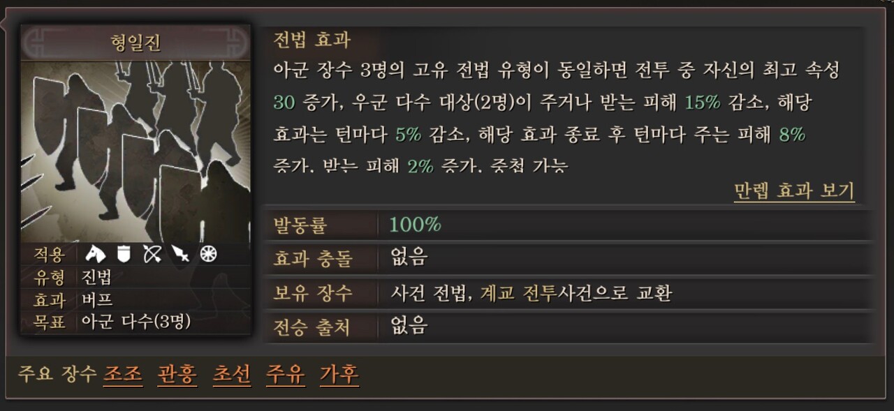 신규 사건 전법 형일진은 공손찬, 원소, 전풍, 안량, 문추, 조운 중 4명의 장수를 모아 교환 가능합니다. 아군 장수 3명의 첫 번째 진법이 동일한 패시브/ 지휘/ 액티브/ 돌격 전법일 경우 발동하며, 돌격과 패시브보다 액티브와 지휘 전법으로 매칭 하는 방식이 유리합니다.