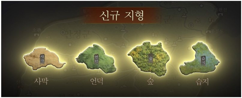 오는 7월 2일에는 PK 신규 시나리오 군쟁지리도 추가됩니다. 군쟁지리는 숲, 언덕, 습지, 사막 4개의 지형이 신규로 추가되었으며, 지형마다 실제 전쟁 현장에 맞는 독특한 효과를 가지고 있는 점이 특징입니다. 또한 남방 지역은 습지가 많고, 서량은 사막이 많은 특징을 가지고 있으며 숲에서는 시야 범위 감소, 습지에서는 전투 시 전력 손실 증가 등의 환경에 따른 페널티가 적용됩니다.