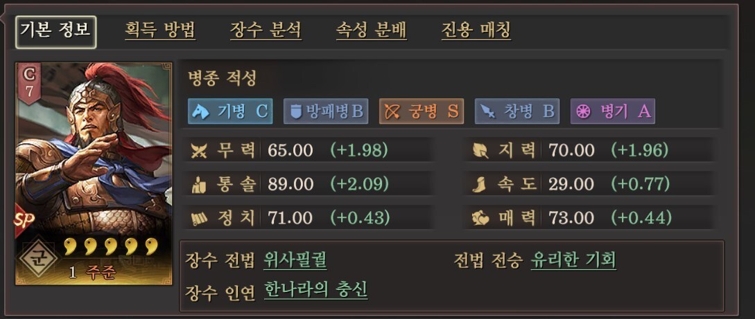 Pk시즌 군쟁지리에서는 SP주준을 시작으로 신규 장수들이 추가됩니다. SP주준의 경우 동한 말기 명장으로 일반 무력과 지력 및 통솔까지 밸런스 있게 뛰어는 문무를 겸비한 점이 특징입니다. 또한 위사필궐 고유 전법으로 책략 피해는 감소시키는 전법 효과를 가지고 있어 책략덱을 사용하는 적을 공략하기에 안성맞춤이기도 합니다.
