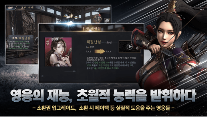 웅재삼국은 각기 다른 웅재를 가진 장수들을 바탕으로 전쟁의 스케일부터 다른 대구모 전투 콘텐츠인 황성 쟁탈전이 준비되어 있고, 영웅의 재능으로 초월적 능력을 발휘해 장수 획득에 실질적인 도움을 주는 영웅들까지 쉽게 접하기 힘든 콘텐츠와 시스템이 준비되어 있습니다.