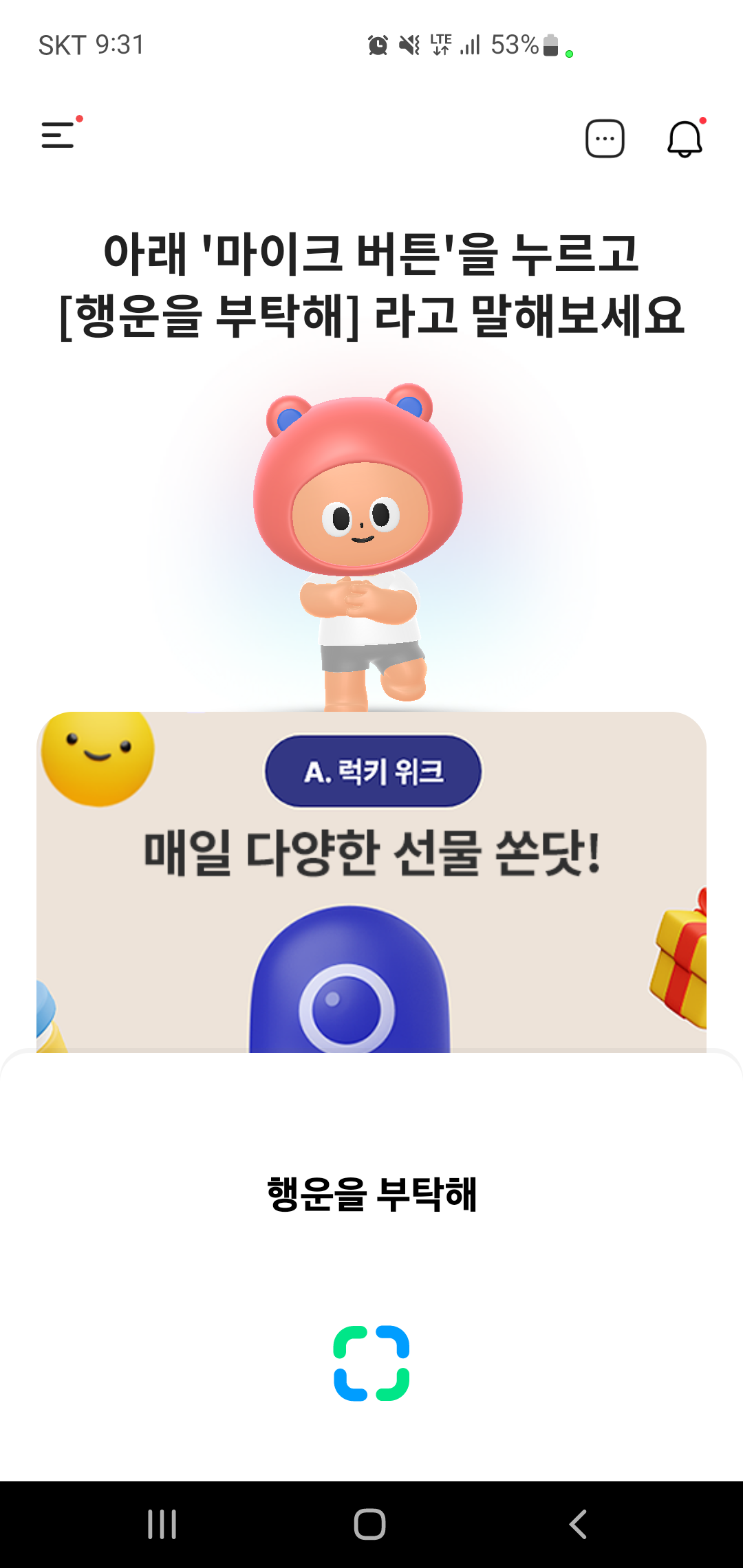 A. 럭키위크가 진행되는 7/17 일 9시~23시 59분 59초까지 하루에 한번 행운을 부탁해 라고 말하면 바로 당첨여부를 확인할 수 있습니다. 아쉽게도 아직 이벤트에 당첨되는 행운을 누려보지는 못했지만, 매일 5천명에게 럭키 아이템이 주어지는 만큼 언젠가는 행운의 주인공이 되지 않을까요?