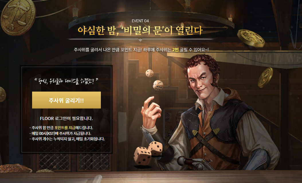 마지막으로 주사위를 굴려 나온 만큼 포인트를 지급받을 수 있는 야심한 밤, 비밀의 문이 열린다 이벤트도 진행 중입니다. FLOOR 로그인 후 주사위를 두 번 굴려 나온 합만큼 포인트를 지급 맡을 수 있는데요, 주사위 개수는 누적되지 않고 매일 초기화되는 만큼 매일매일 참여하고 포인트를 획득하는 게 중요할 것 같습니다.