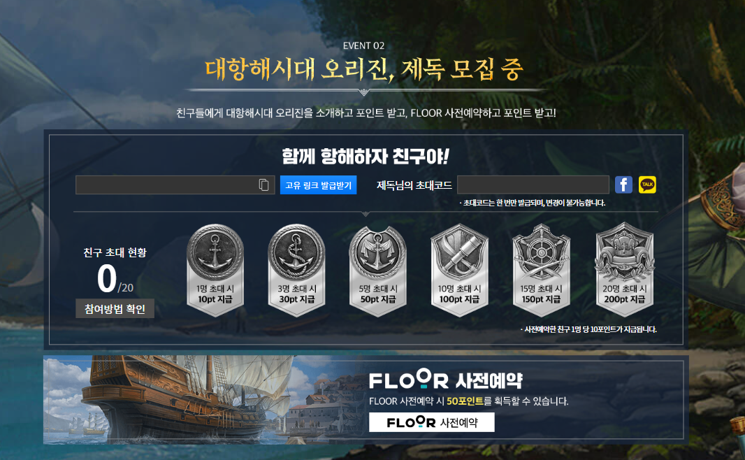 포인트는 FLOOR 사전예약 참여 시 50포인트를 받을 수 있는 것을 시작으로 친구들에게 대항해시대 오리진을 소개하고 전달한 초대 코드로 사전예약에 참여하면 1명 당 10포인트씩 적립을 받을 수 있습니다. 크로스 플랫폼 게임 대항해시대 오리진을 함께 즐기고 싶은 친구가 있다면 적극 활용하고 원하는 선물의 주인공이 되어 보는 건 어떨까요?