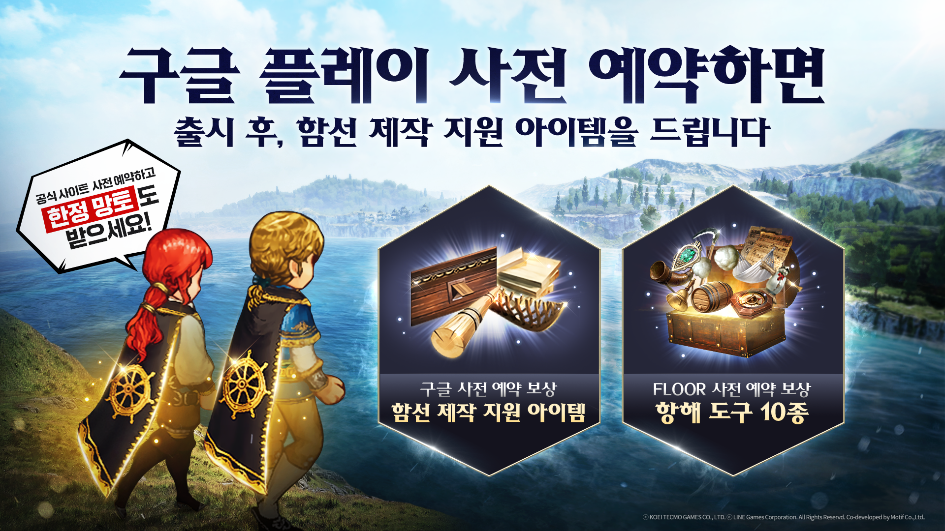 구글 사전예약에 참여하면 함선 제작 지원 아이템인 소형 용골 1개와 삼나무 80개, 삼나무 돛대 40개 그리고 훈련용 포문 20개를 추가로 받을 수 있습니다. 구글 계정이 있다면 클릭 한번 만으로 사전예약에 참여할 수 있는 데다, 기존 사전예약 보상에 추가로 받을 수 있습니다.