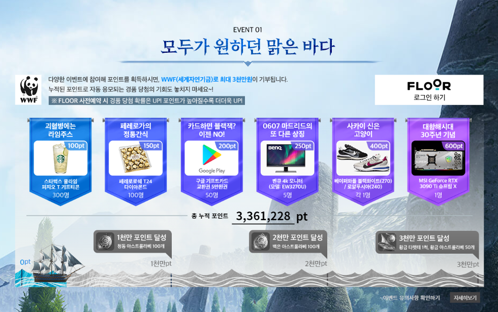 사전예약과 함께 다양한 이벤트도 진행 중입니다. 사전예약 페이지에서 진행되는 이벤트에 참여하고 획득한 포인트로 스타벅스 쿨라임 피지오 기프티콘부터 벤큐4K모니터, MSI GeForce RTX 3090 Ti 슈프림X에 이르기까지 원하는 경품에 자동 응모가 가능한데요, 특히 최대 3천만 원까지 누적된 포인트로 WWF에 기부된다고 하니 선물도 받고 기부도 할 수 있습니다.