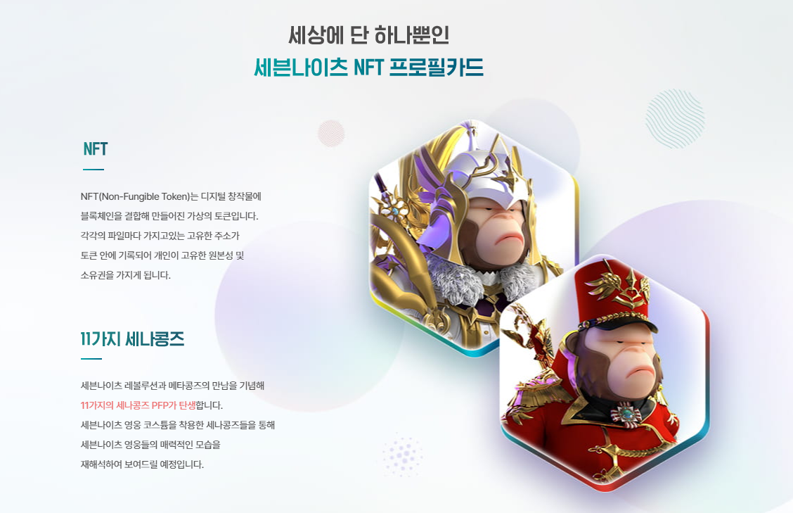 세나 레볼 x 메타콩즈 콜라보 NFT 자선경매도 진행 중입니다. 일명 세나콩즈는 NFT 시장의 중심에 있는 메타콩즈와 8년간 글로벌 4000만 명 이상의 유저들에게 사랑받은 세븐나이츠 영웅들의 모습에 영감을 받아 탄생한 PFP*NFT 프로젝트로 세븐나이츠 영웅으로 변신한 메타콩즈 NFT로 만나볼 수 있습니다.