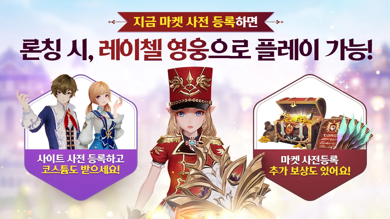 공식 홈페이지 사전예약 외에 마켓 사전등록에 참여하면 레이첼 영웅카드와 강화 재료 팩 등의 추가 아이템 획득도 가능합니다. 마켓 사전예약은 별다른 입력 없이 클릭 한 번으로 참여 가능하고 그에 따른 추가 보상을 챙길 수 있으니 구글 플레이와 애플 앱 플레이를 통한 사전예약도 꼭 챙겨보세요!