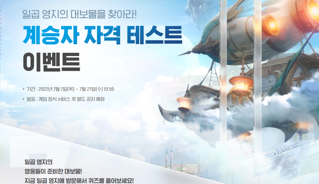 세븐나이츠 레볼루션 사전예약에 참여했다면 7월 27일까지 진행되는 계승자 자격 테스트 이벤트도 꼭 챙겨보시기 바랍니다. 원하는 경품이 걸린 영지를 선택해 해당 영지의 퀴즈를 풀고 계승자의 인증서를 획득한 후 SNS에 공유하면 응모자격이 주어지는데요, 24K 세븐나이츠 황금 영웅 카드를 비롯해 아이패드 PRO, 호주 왕복 항공권, 게이밍 헤드셋 등 어마어마한 선물이 준비되어 있으니 잊지 마시고 참여해 선물의 주인공이 되어보시기 바랍니다.