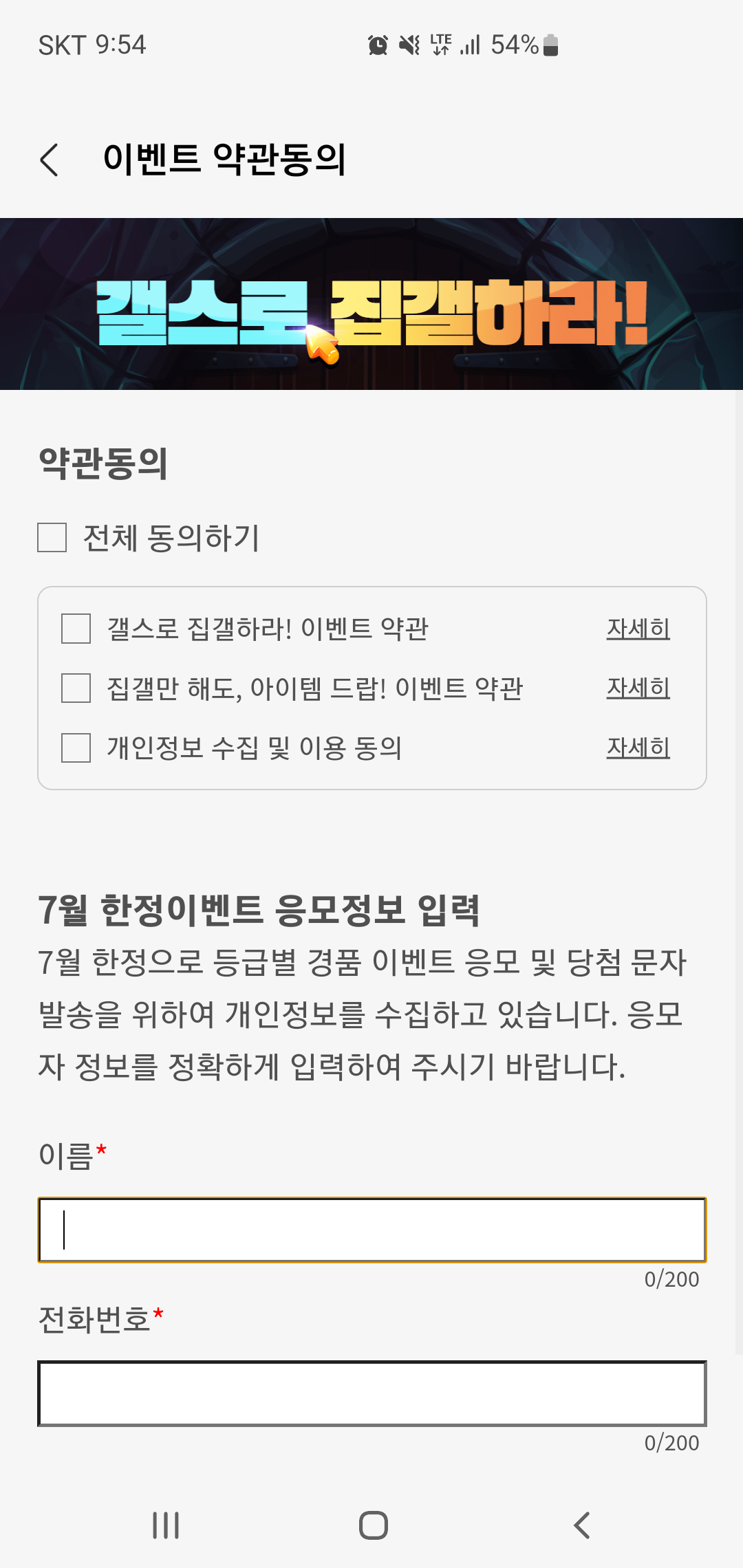 삼성전자 멤버십에 가입되어 있다면 갤스로 집갤하라 참여하기 버튼을 클릭한 후 간단한 이벤트 참여하기 약관에 동의하고, 7월 한정 응모정보 입력까지 진행하면 혜택을 받을 수 있습니다.