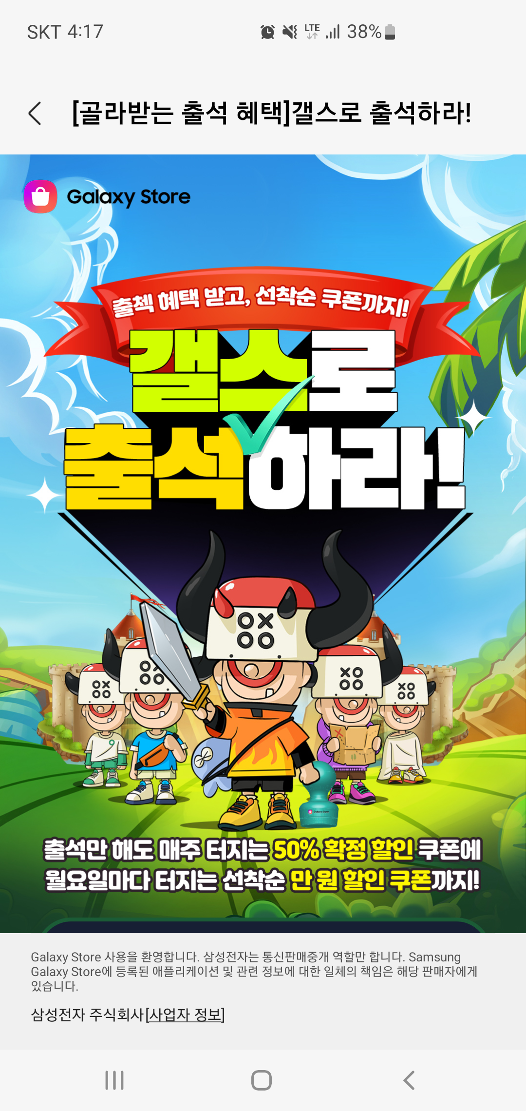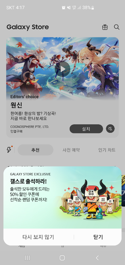 특히 매주 월요일에는 선착순 집갤로 스페셜 게임 50% 할인 쿠폰과 랜덤 할인 쿠폰을 선착순으로 지급하는데요, 매주 월요일 어떤 게임 쿠폰이 지급되는지 알 수 없는 만큼 조금 서둘러 확인하고 쿠폰을 챙길 필요가 있어 보입니다. 갤스로 집갤하라 프로모선과 갤스로 출석하라 이벤트만 잘 챙겨도 사용한 이상의 혜택을 돌라 받을 수 있는 지금 평소 모바일게임 유료 아이템을 구매하는 분들이라면 갤럭시스토어를 이용해 삼성전자 포인트와 10% 할인 쿠폰까지 모두 챙겨보시기 바랍니다.