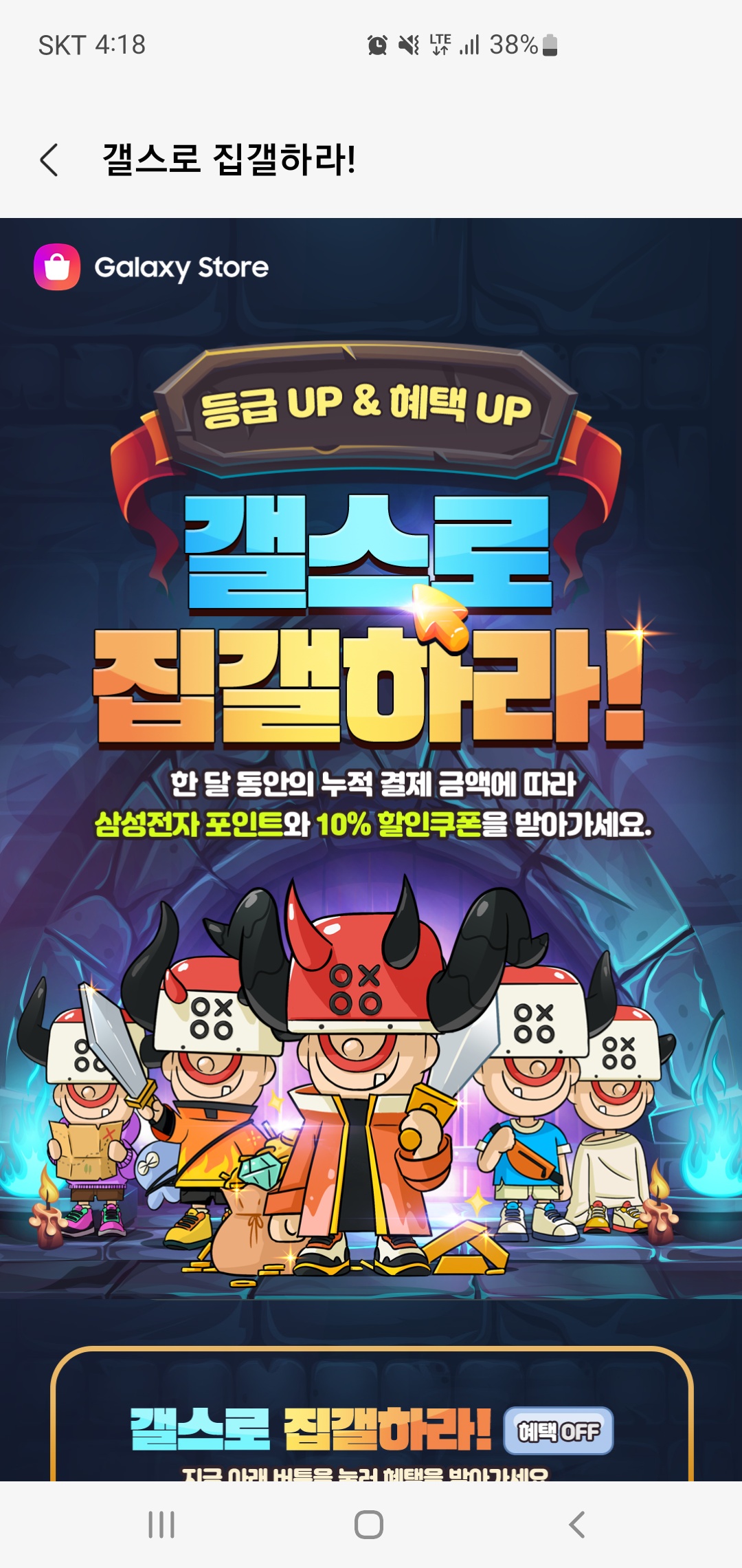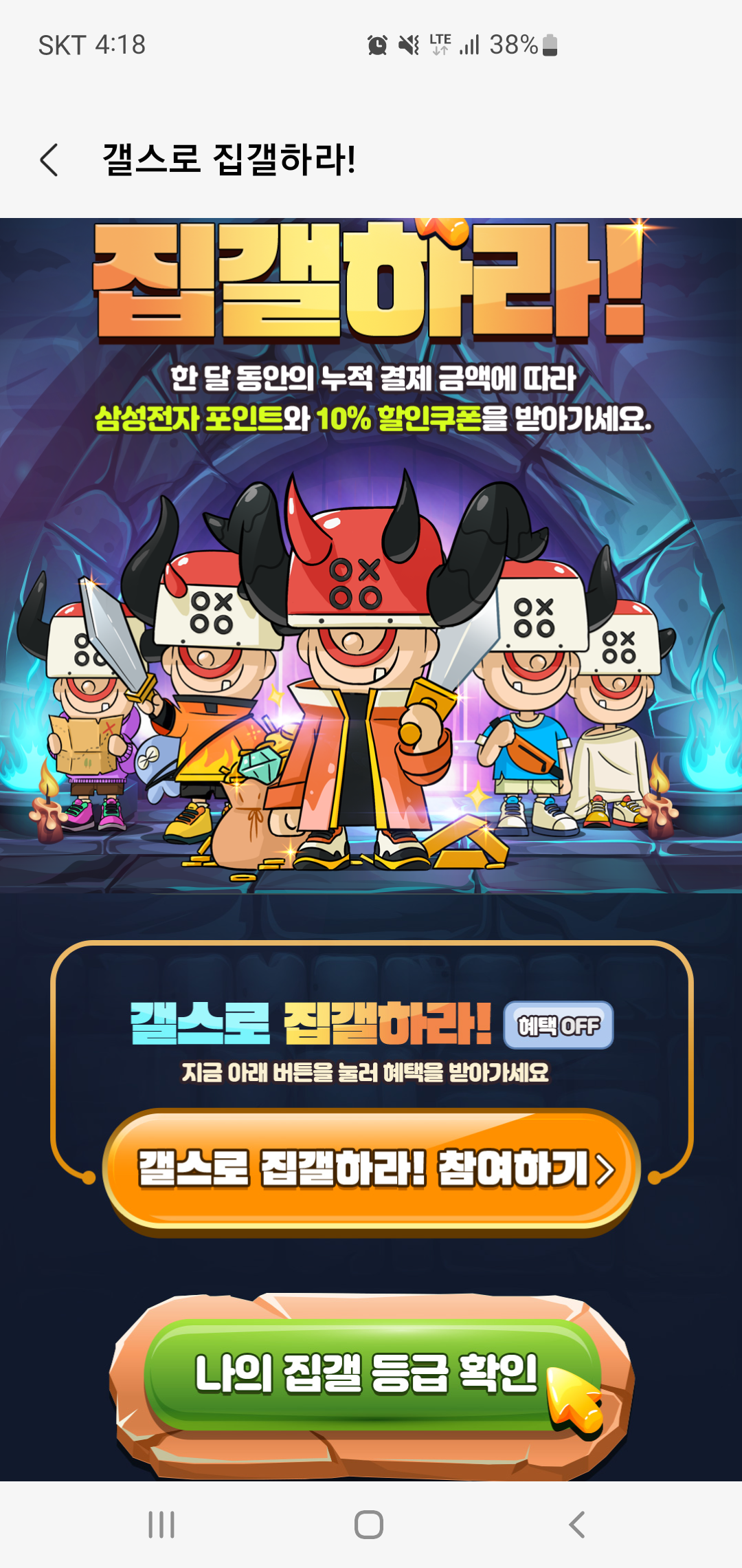 갤스로 집갤하라 이벤트에 참여하면 매월 게임 아이템 구매 누적 금액에 따른 삼성 포인트와 10% 할인 쿠폰이 자동으로 지급됩니다. 이때 집갤 등급 기준에 따라 Lv1 일반등급부터 Lv6 신화 등급까지 차등으로 삼성전자 포인트와 할인쿠폰이 차등 지급됩니다.