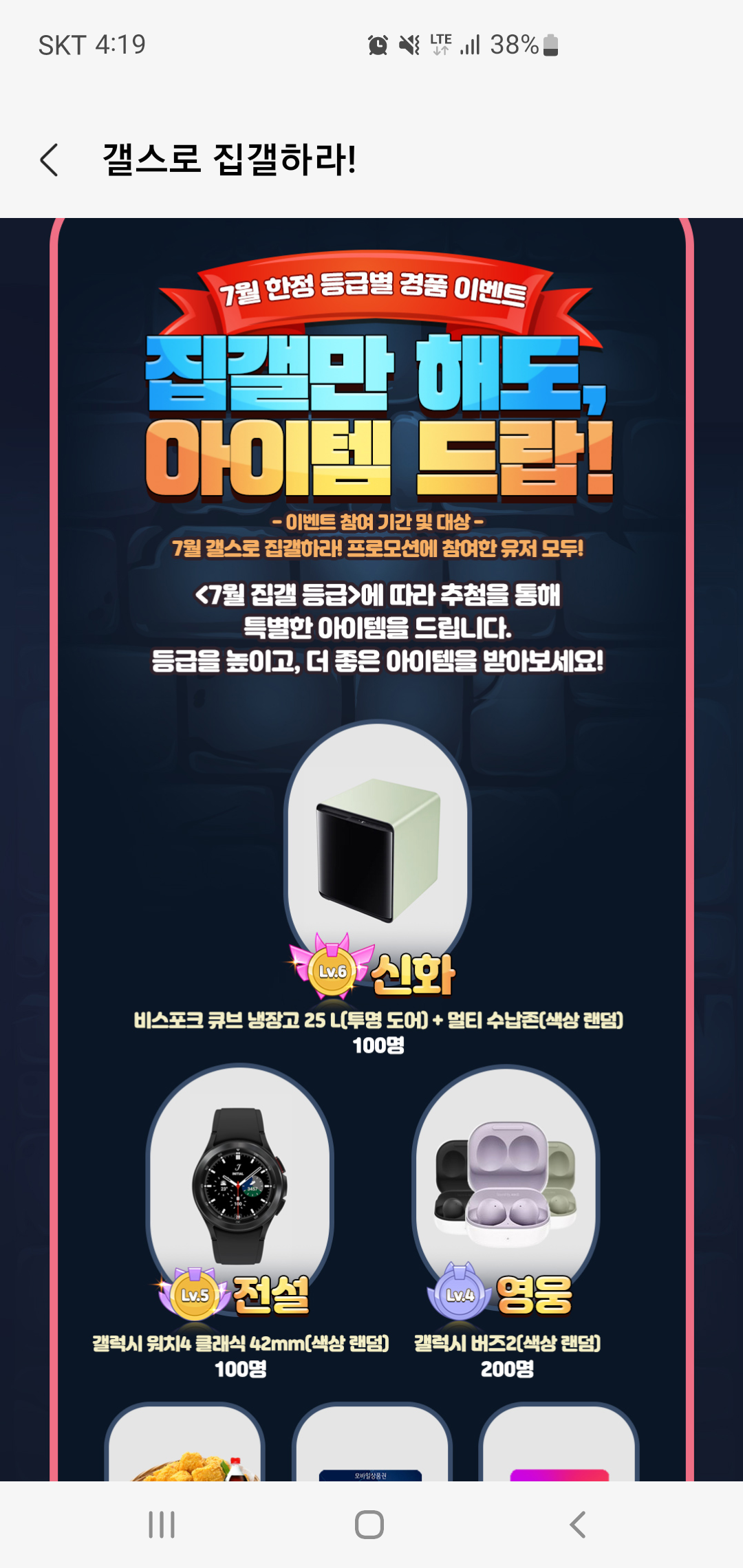 7월 한정 등급별 경품 이벤트도 준비되어 있는데요, 7월 갤스로 집결하라 프로모션에 참여한 유저 중 추첨을 통해 갤럭시 스토어에서 준비한 특별한 선물을 받을 수 있습니다.